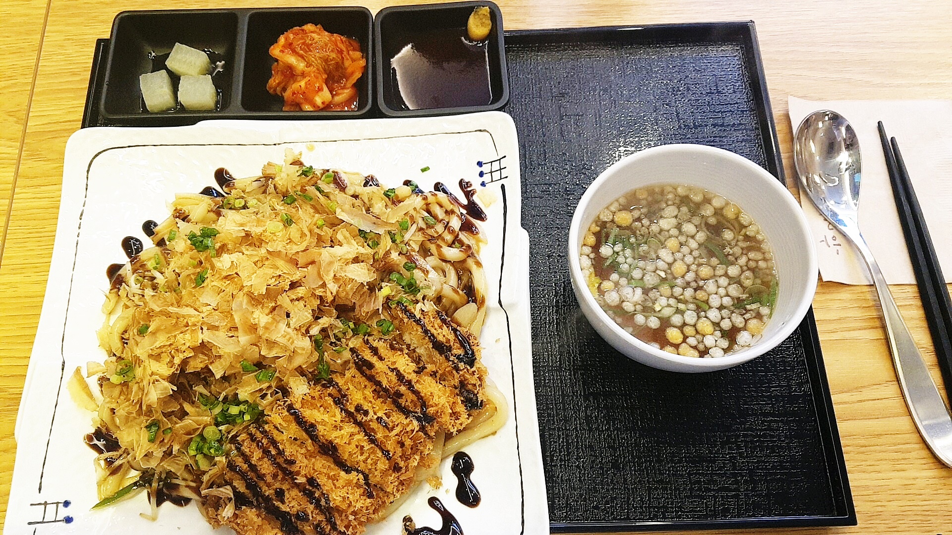제가 주문한 음식인 "돈까스가 들어가 있는 야끼우동" 이 나왔어요. 도톰한 돈까스에 가쓰오부시로 덮힌 볶음우동이 제 침샘을 자극하네요. 짭쪼름한 것이 너무 맛있어요. 큰 아이가 제 걸 빼앗아 먹었어요. 맛있다며 다음엔 야끼우동 시켜야겠다네요.