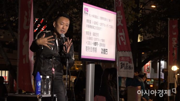 그의 행보는 정말 파격의 연속이었다고 해요. 2013년 참의원에 당선되자 아키히토 일왕에게 직접 후쿠시마 원전 피해 실상을 알리는 편지를 전달하여 파문이 일었고 '노이즈 마케팅' 으로 존재감을 알렸답니다. 일본에선 일왕이 정치에 관여할 수 없는데 참의원이 직접 정치문제를 편지로 전달했으니 그 당시 대단한 일이었다고 하지요.