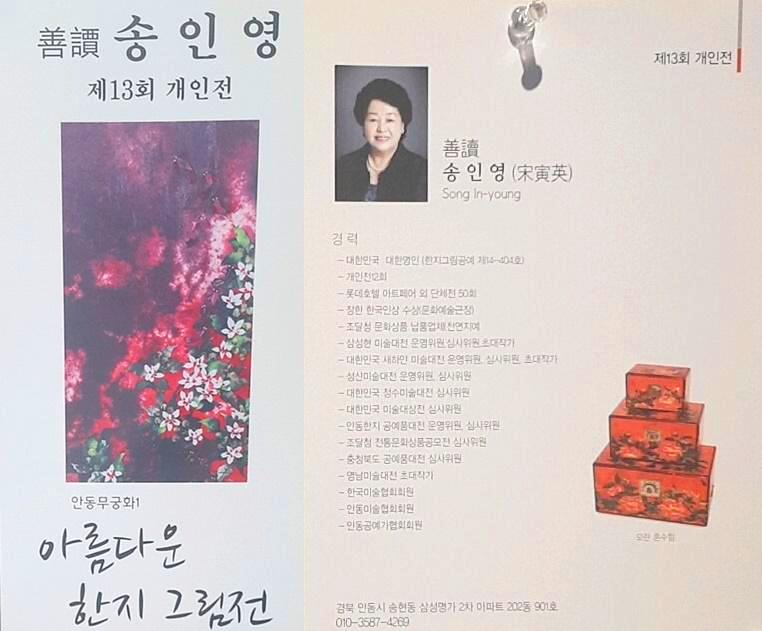 3층에 있는 갤러리로 갔더니 송인영 작가의 「아름다운 한지 그림전」 작품이 전시되어 있었어요. 그 곳 입구에 작가 선생님이 직접 계셨는데 사진을 찍지 말아달라고 하셔서 눈으로 열심히 작품을 보고 왔답니다. 그림뿐 아니라 콘솔, 상자함, 테이블 등에 한지로 작품을 만들어놨더라구요. 사실 갖고 싶다는 생각이 들 정도로 멋진 작품이었어요.