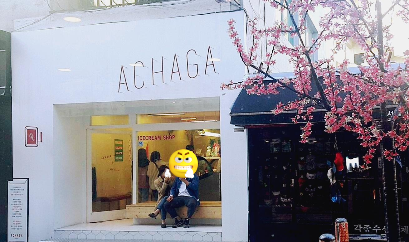 점심을 해결하고 버거킹 맞은 편에 있는 작은 아이스크림 가게. 「아차가 ACHAGA」 젤라또와 샤벳 등의 아이스크림을 파는 곳.