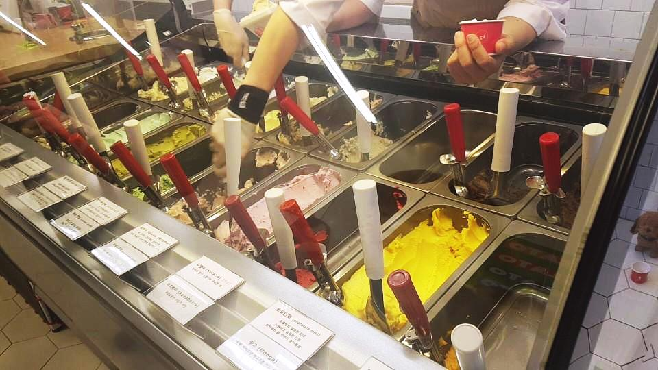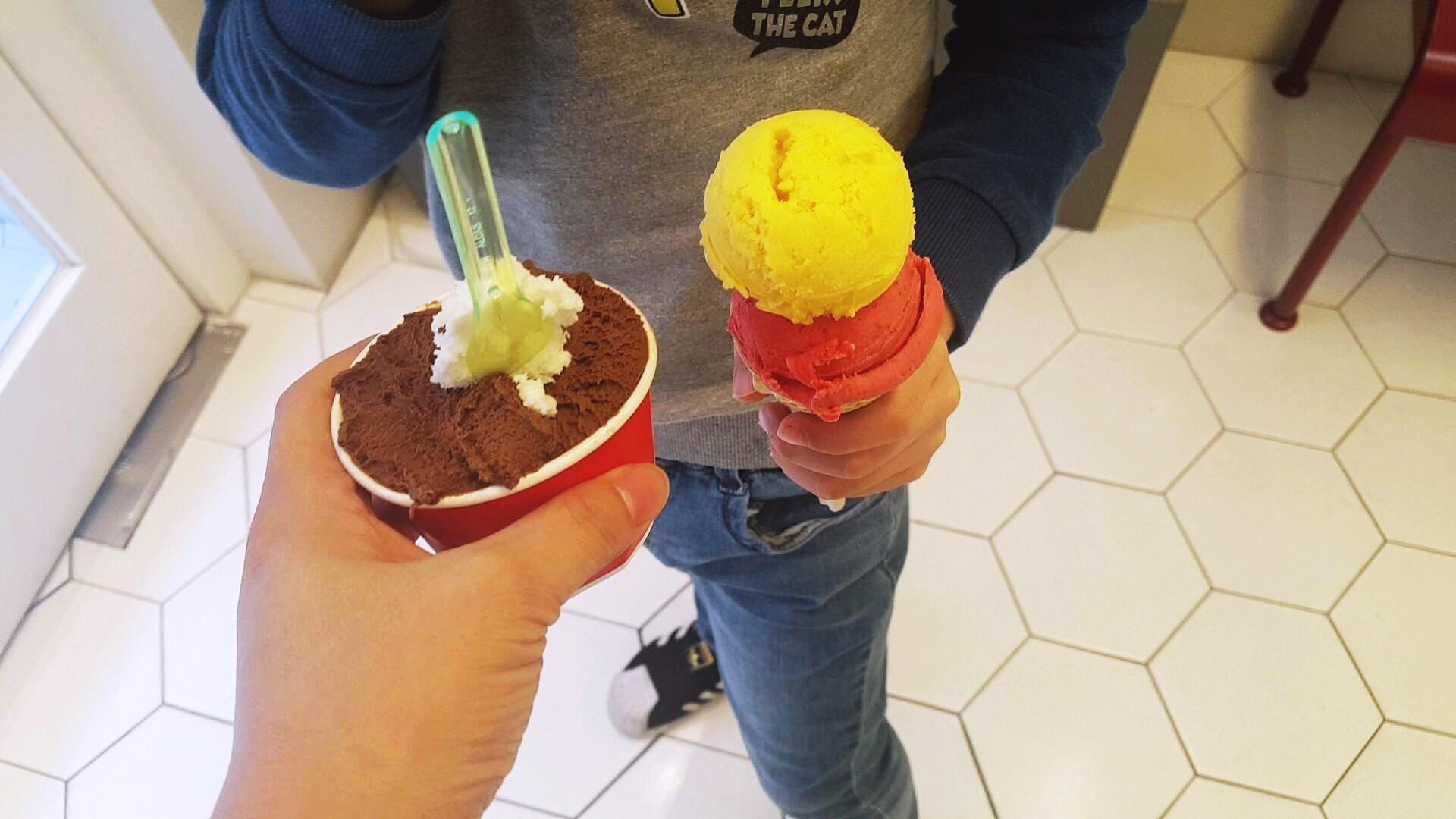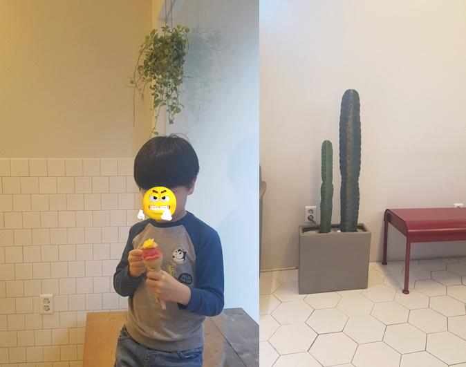 아이는 "산딸기 쌰베트" 랑 "망고" 맛을 선택했고, 나는 "진한초코" 를 주문해서 먹었어요. 초코 위에 하얀 아이스크림은 가게 주인이 맛보고 싶은 거 고르라고 하셨는데 제가 잘 모르겠다고 했어요. 그랬더니 쌀맛이 맛있다고 추천해주시면서 저렇게 얹어주시네요. 쌀맛이 별로일거라 생각했는데 고소하고 달콤한 것이 쌀맛으로 선택할 걸 하고 후회될만큼 맛있었어요.