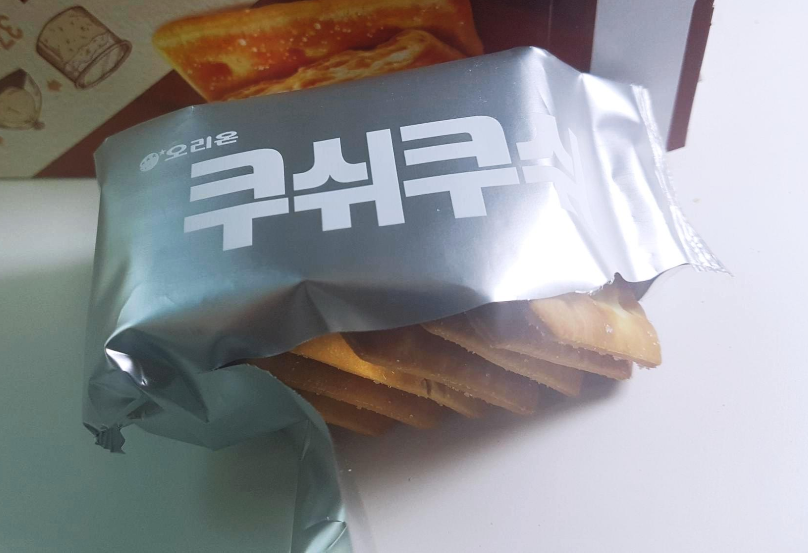 쿠쉬쿠쉬는 겹겹히 만들어져 있어서 한 입 베어먹으면 바삭거리는 소리가 즐거우면서 조각들이 입 안을 베지 않아서 좋았고 바삭거리는 느낌이 참크래커보다는 부드럽습니다.