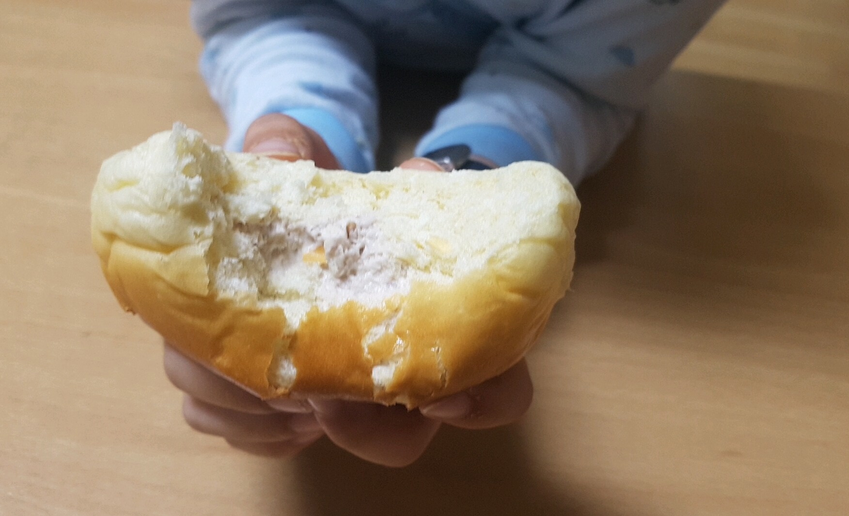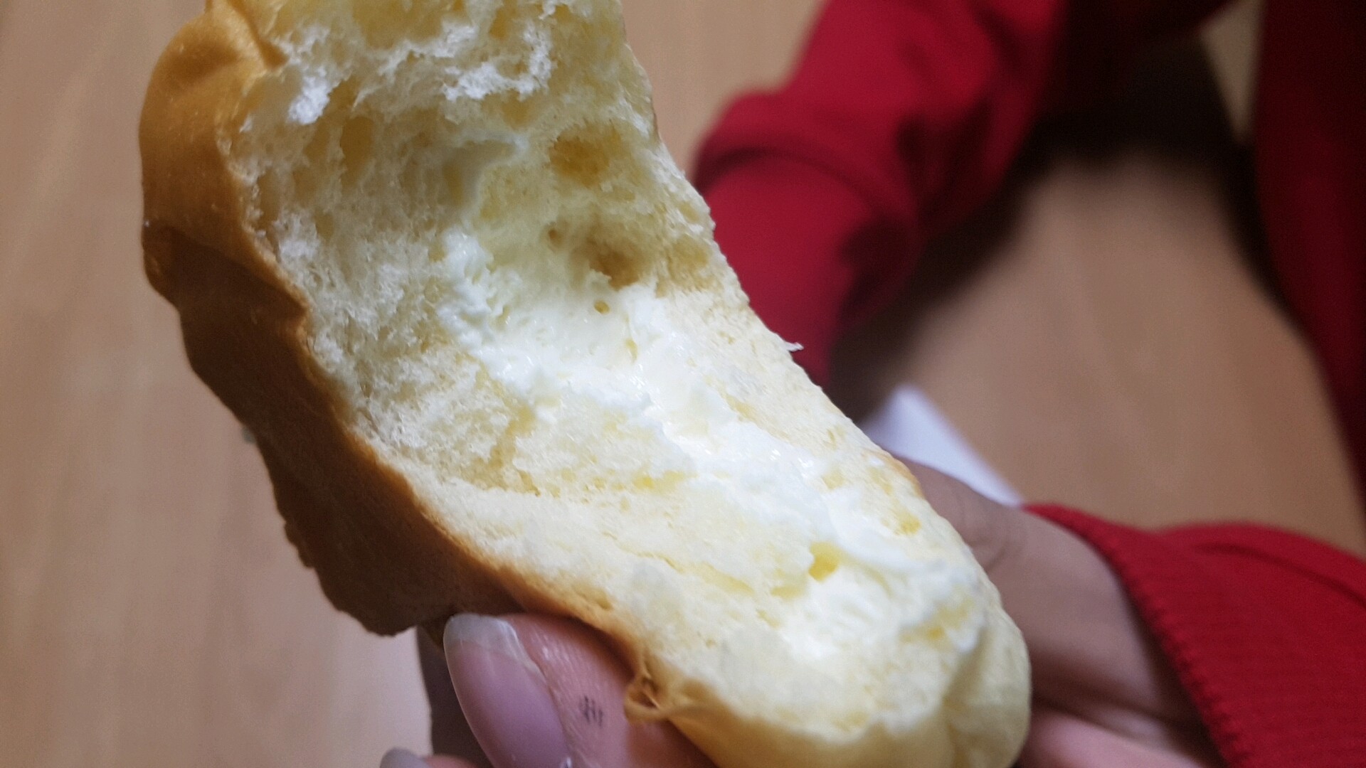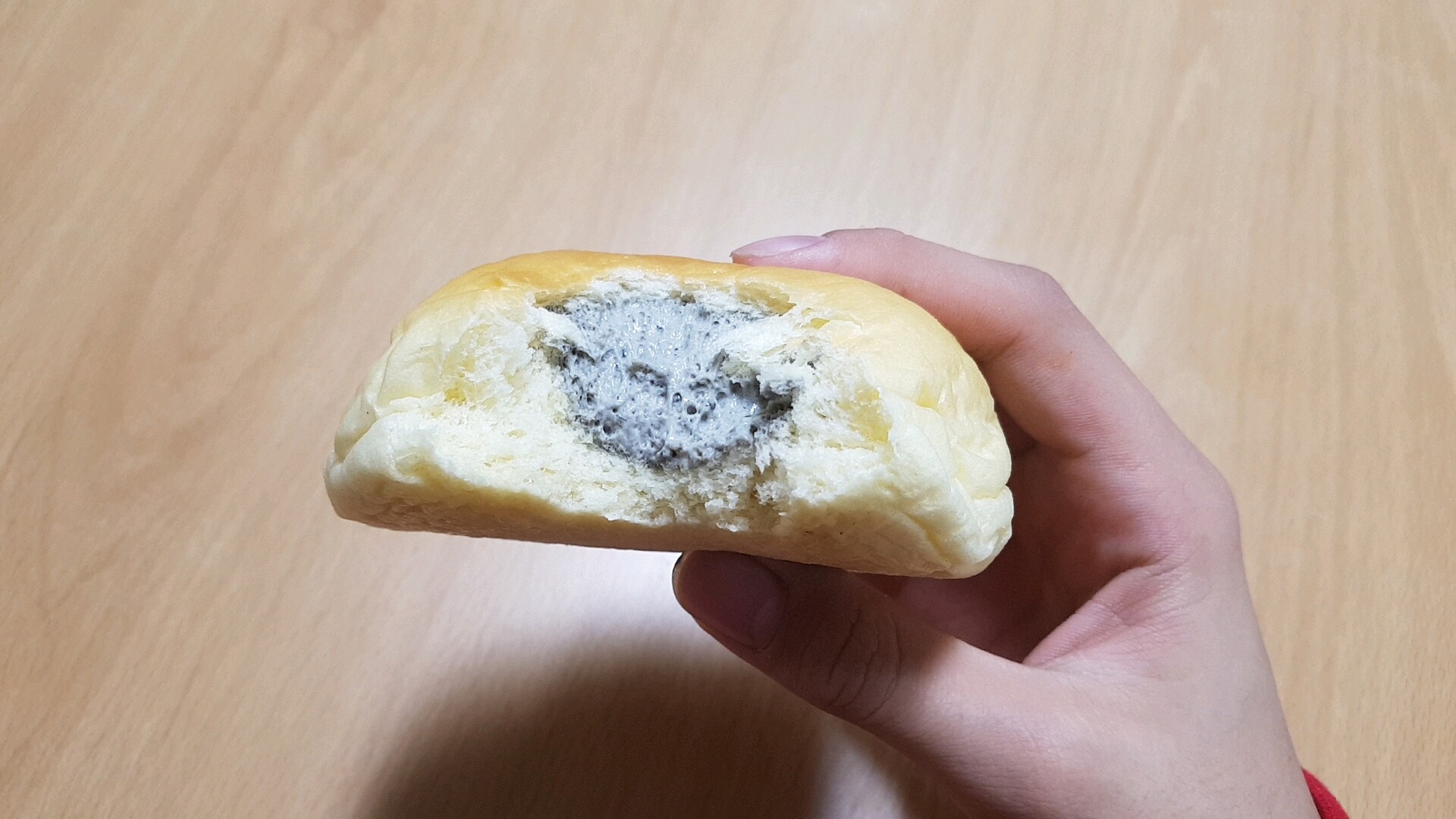 월영교달빵의 팥맛. 작은 아이의 팥 크림 맛은 팥 앙큼이 들어가 있을 거라 생각하면서 팥 색깔을 상상했는데 의외로 옅은 크림이었어요. 아이가 원하는 비주얼은 아니었지만 맛은 달콤하지만 달지 않은 그런 맛.