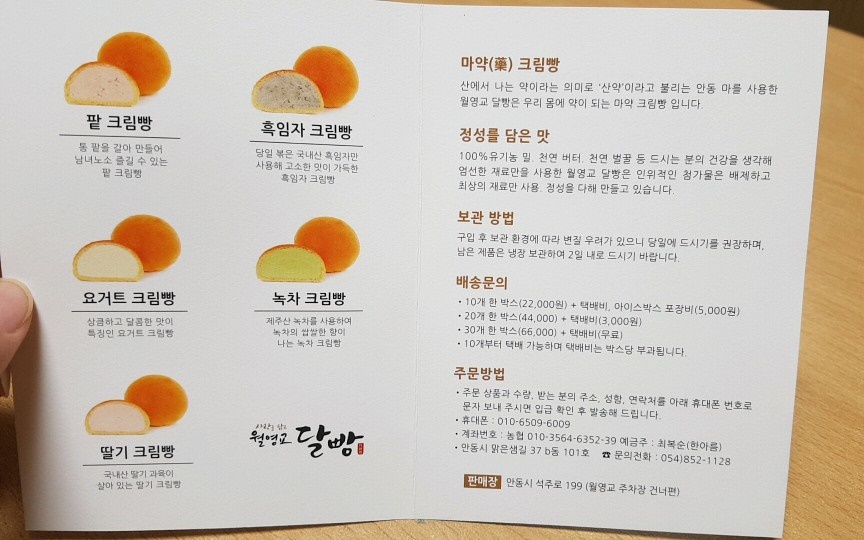 월영교달빵은 차갑게 먹어야 제맛인데 아주머니가 바로 드실 거냐고 물으셔서 임청각에도 들려야 해서 30분 이상 걸릴 거라고 하니 아이스 팩을 하나 넣어주셨어요. 택배도 가능하네요. 위 그림에서 보면 배송 문의와 주문 방법이 자세히 설명이 되어 있어요. 연락처도 있으니 참고하셔도 돼요.