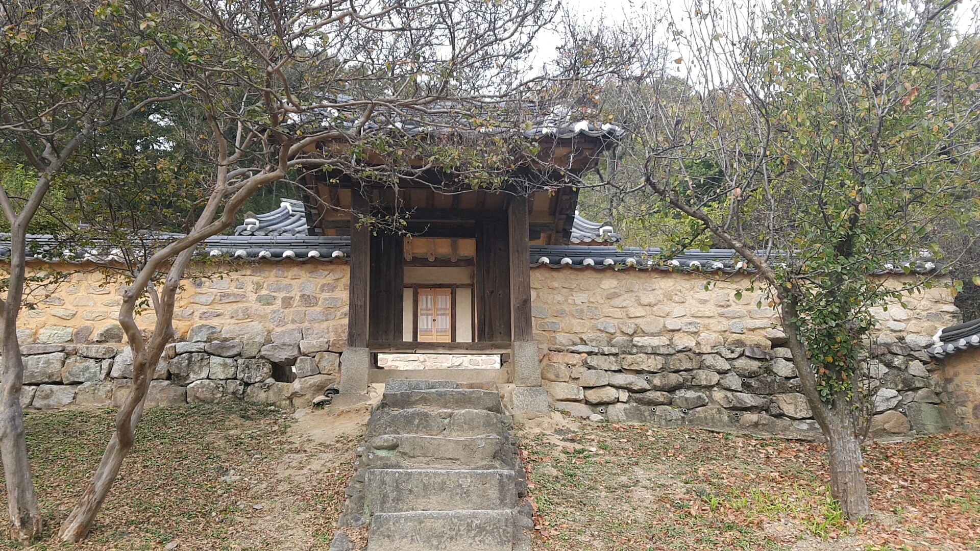 바깥행랑채에서 본 사랑채로 들어가는 계단입구에요. 사랑채 마당에는 사람들이 거주하는 것 같아서 사이문을 통해 군자정으로 갔어요.