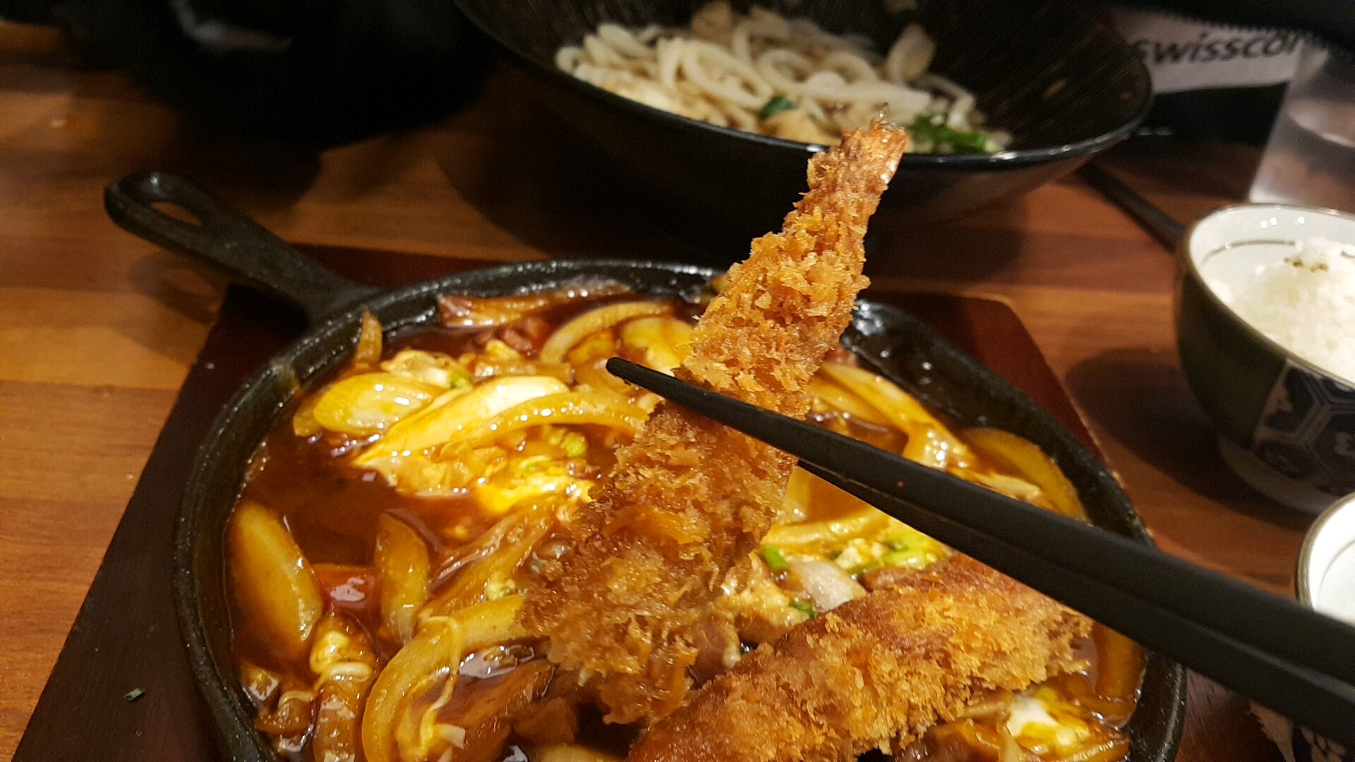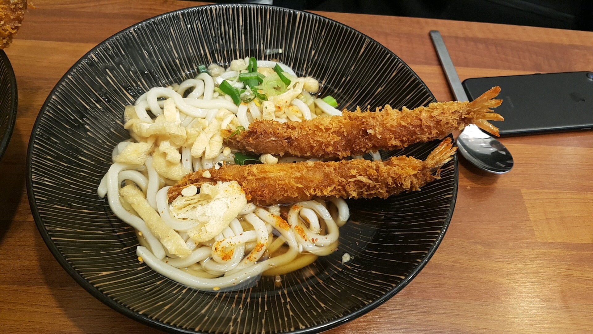 음식이 나오기 시작했어요. 새우튀김우동 2 그릇이 먼저 나왔는데 커다란 그릇에 맞게 새우튀김도 정말 크네요.