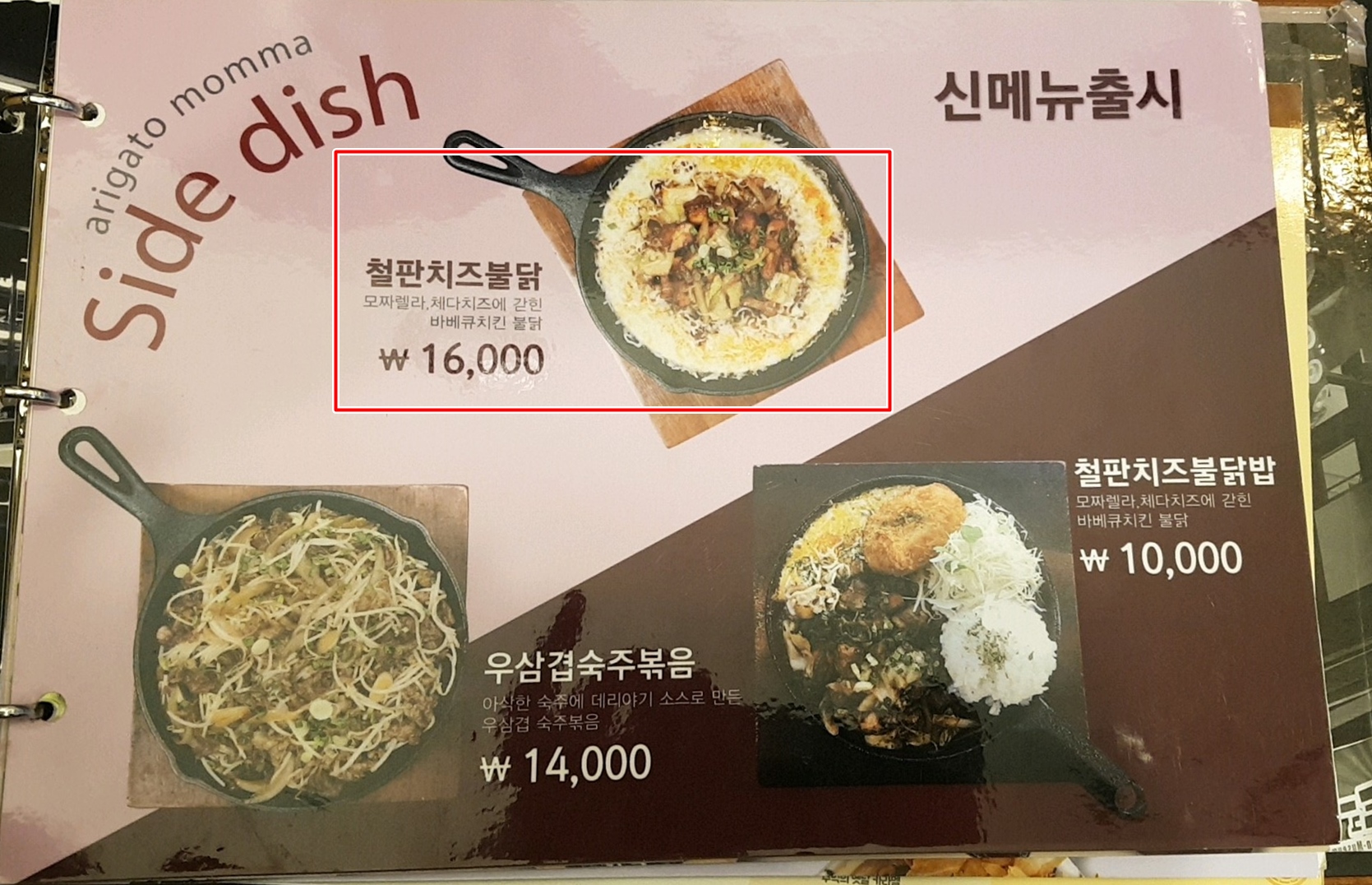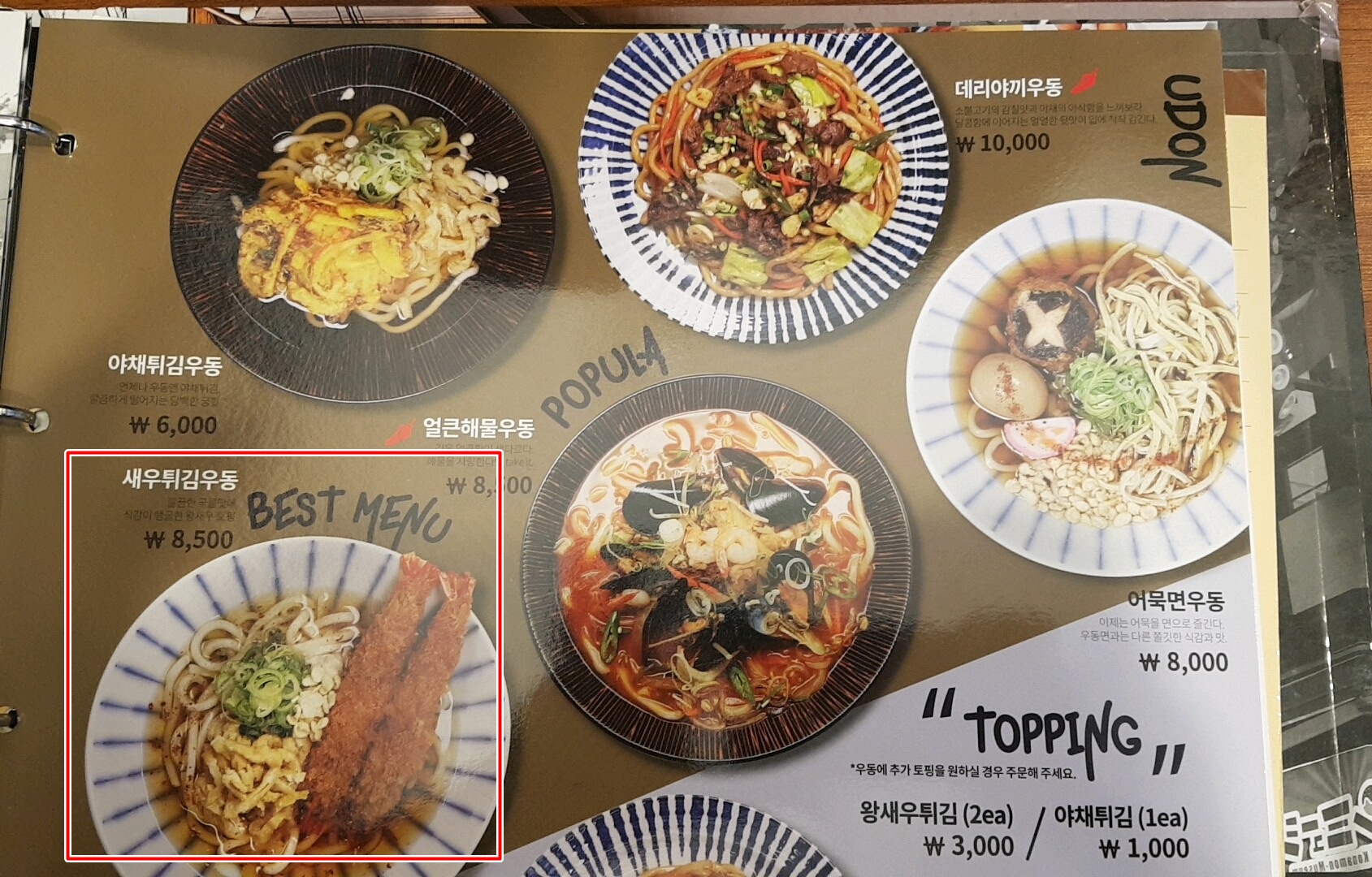 메뉴판 앞 표지가 일본스럽네요. 큰 아이와 작은 아이가 새우튀김우동 각각 1개씩 주문했고, 철판치즈불닭은 저와 큰 아이가 같이 먹을려고 골랐어요.