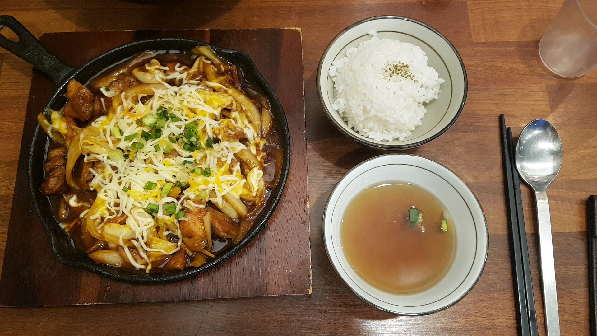불닭에 있는 닭고기는 아들에게 양보하고 저는 치즈랑 야채를 함께 먹어줬어요. 그러면 조금 덜 매울까봐서요. 같이 나오는 밥과 함께 먹어야 매운 맛을 줄일 수 있겠더라구요. 그런데 저 밥이 모두 아들 입으로 다 들어가는 바람에 저는 물만 잔뜩 먹어버렸네요.