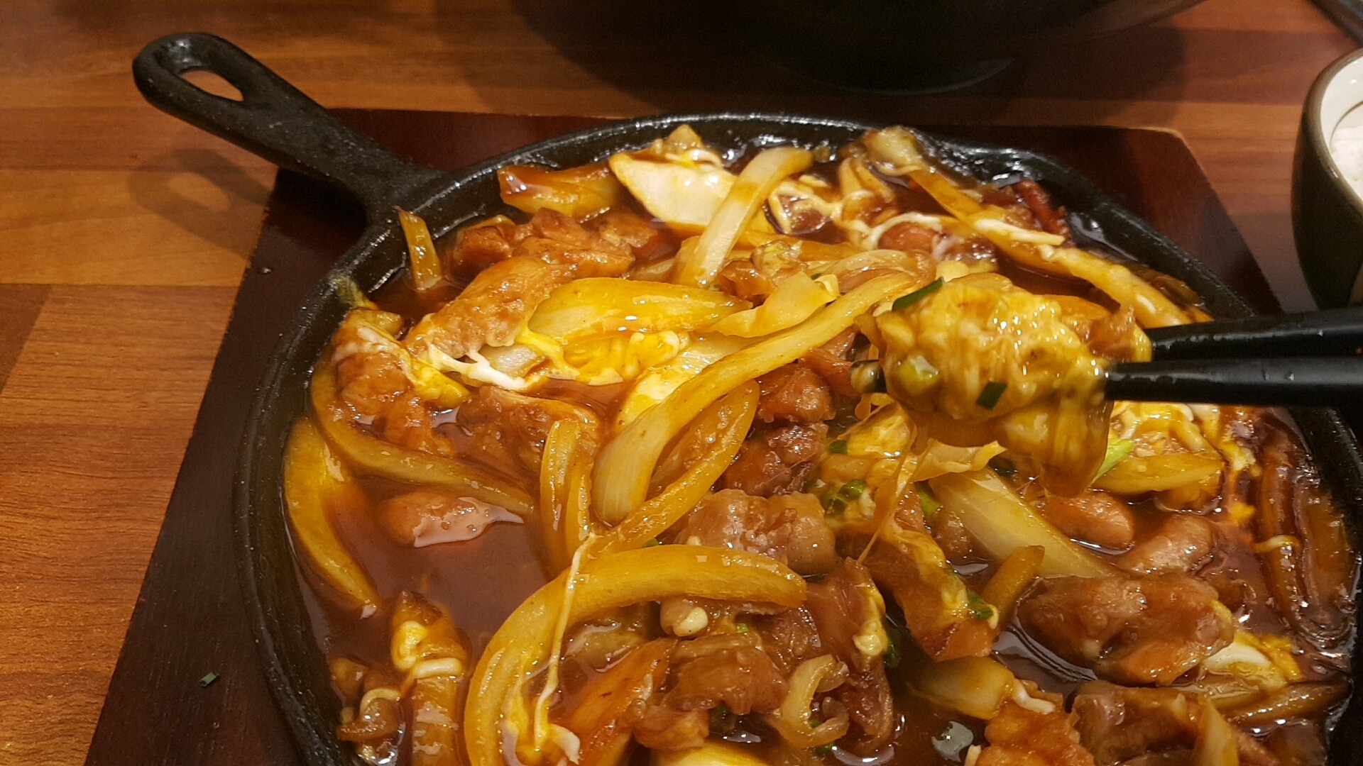 오늘의 메인요리. 철판치즈불닭이 나왔어요. 그런데 메뉴 사진만큼 치즈가 듬뿍 있을 줄 알았는데 조금 달라서 아쉬워요. 뜨거운 불닭에 치즈를 녹일려고 섞어주었어요. 한 입 먹어보니 처음에는 몰랐는데 씹어서 넘기고 나니 굉장히 매운 맛이었어요. 소스는 돈까스 소스와 비슷한 맛이 났는데 매운 맛에 후다닥 씹어 삼켜버렸네요. 불닭 맛을 좋아하시는 분은 추천드려요. 저도 매운 맛은 좋아하는 편인데 매운 맛 중 보통보다는 좀 더 매운 맛이니깐 참고하세요.
