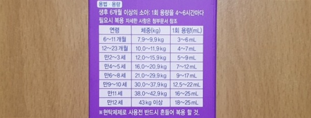 생후 6개월 이상의 소아일 경우, 1회 5 ~7mg 의 용량을 4~ 6시간 간격으로 필요시에 복용한다. 1일 최대 4회(28mg/kg)을 넘기지 않는다. 체중이 30kg 이하인 소아에게는 1일 최대 25ml 을 초과하지 않는다. 체온 38˚C 이상 발생했을 시 몸무게에 비례하여 먹는게 정확하다고 보면 된다.