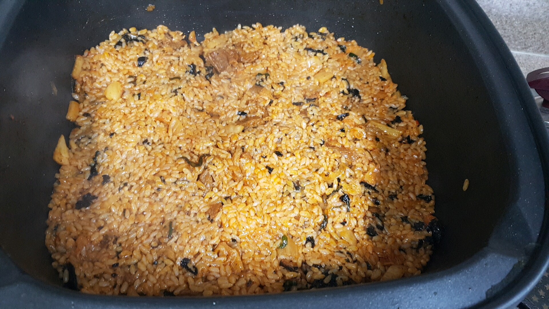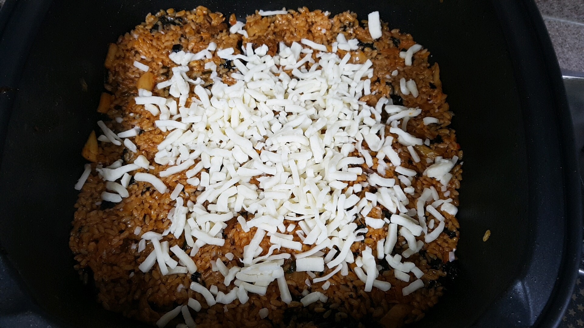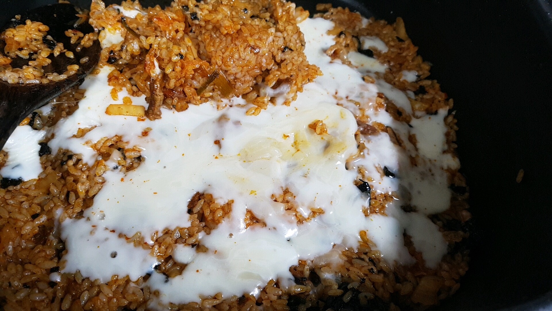고기를 다 덜어내고 남은 양념에 밥을 넣고 총총 썰은 김치를 넣고 조미김을 2개정도 부스러뜨려 함께 볶아요. 그렇게 양념과 재료들이 잘 섞여 볶이면 그 위에 치즈도 함께 올려요.