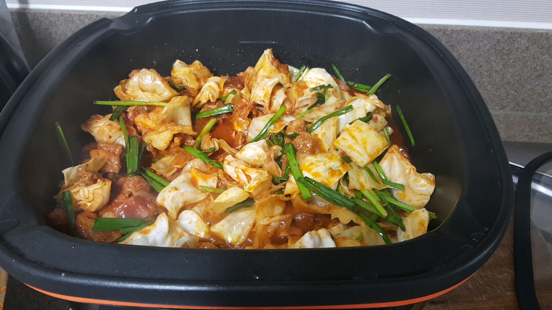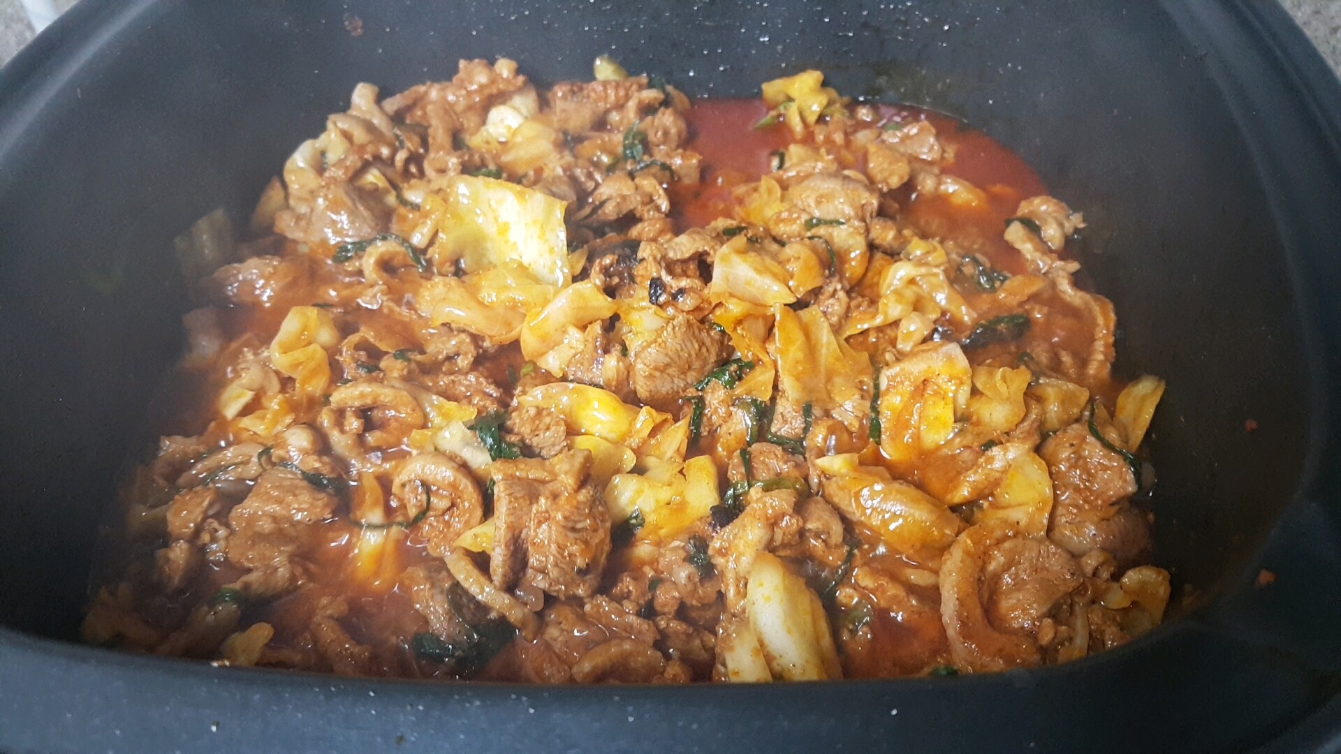 저는 보통 20분 뒤에 양념고기를 꺼내어 구워요. 20분동안 부추 씻어서 썰어놓고, 양배추 썰어놓고 있어요. 그리고 달궈진 팬에 양념고기를 넣고 그 위에 썰어놓은 양배추와 부추를 올려요. 그리고 오리불고기가 자글자글 구워지면 뒤집어서 볶아줍니다.