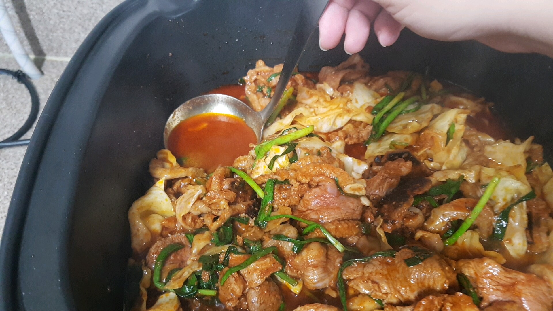 중간중간에 채소에서 나오는 수분과 오리기름, 양념이 섞여서 국물이 많아져요. 그러면 저는 다음에 볶음밥으로 해먹을 생각으로 국물을 따로 덜어놓습니다.