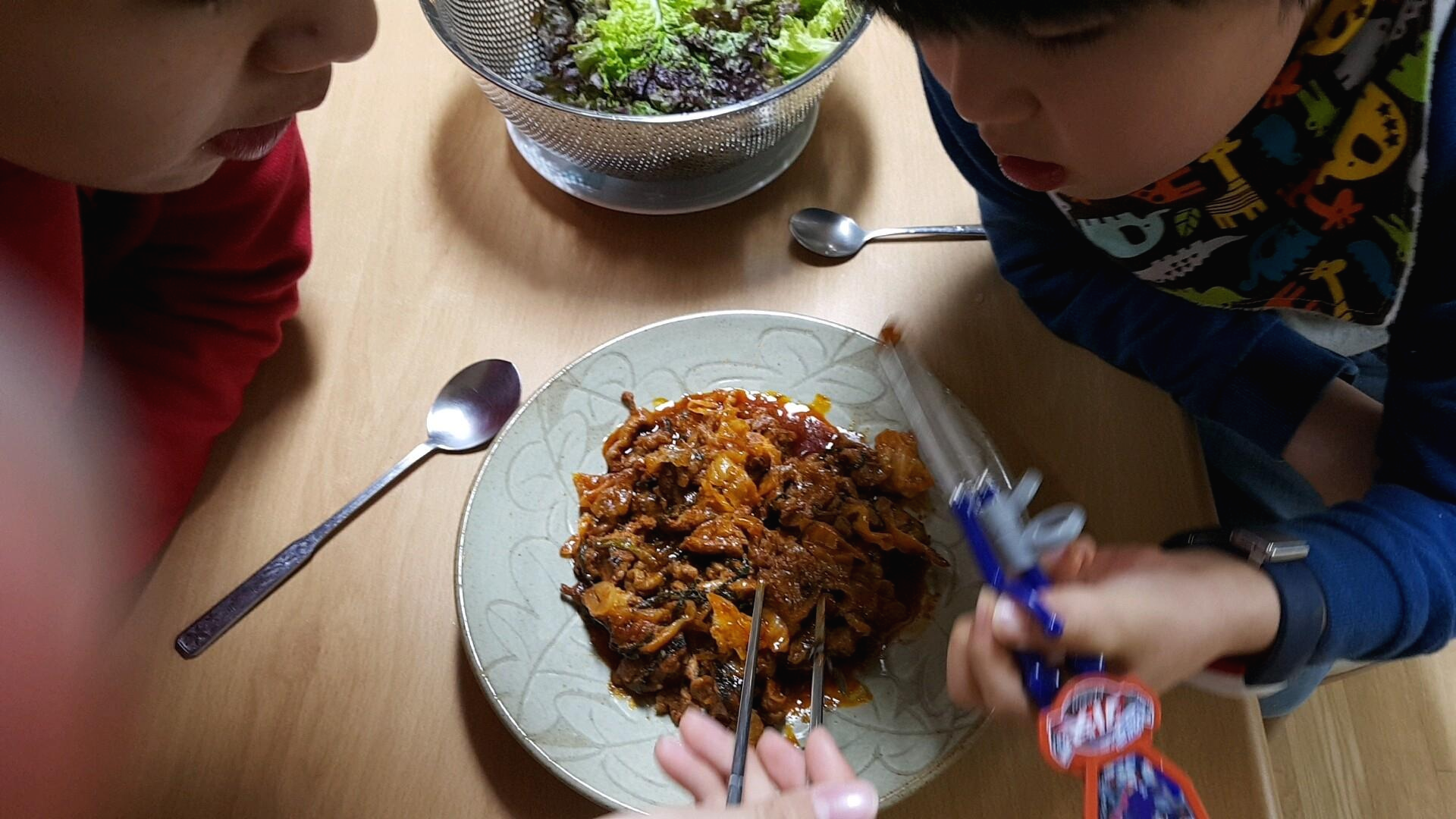 양념고기가 바짝 구워지면 접시에 담아서 드시면 되요. 간단하죠. 저희는 이렇게 아이들과 먹는답니다. 잠깐. 하지만 이게 끝이아니랍니다. 오리불고기를 먹고나면 한 가지 더 요리를 해 먹을 수 있습니다.
