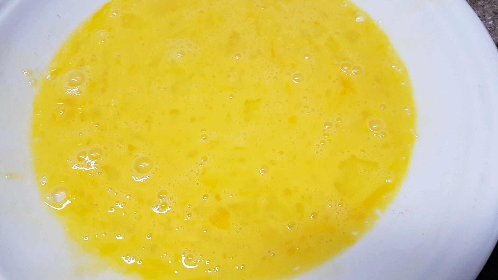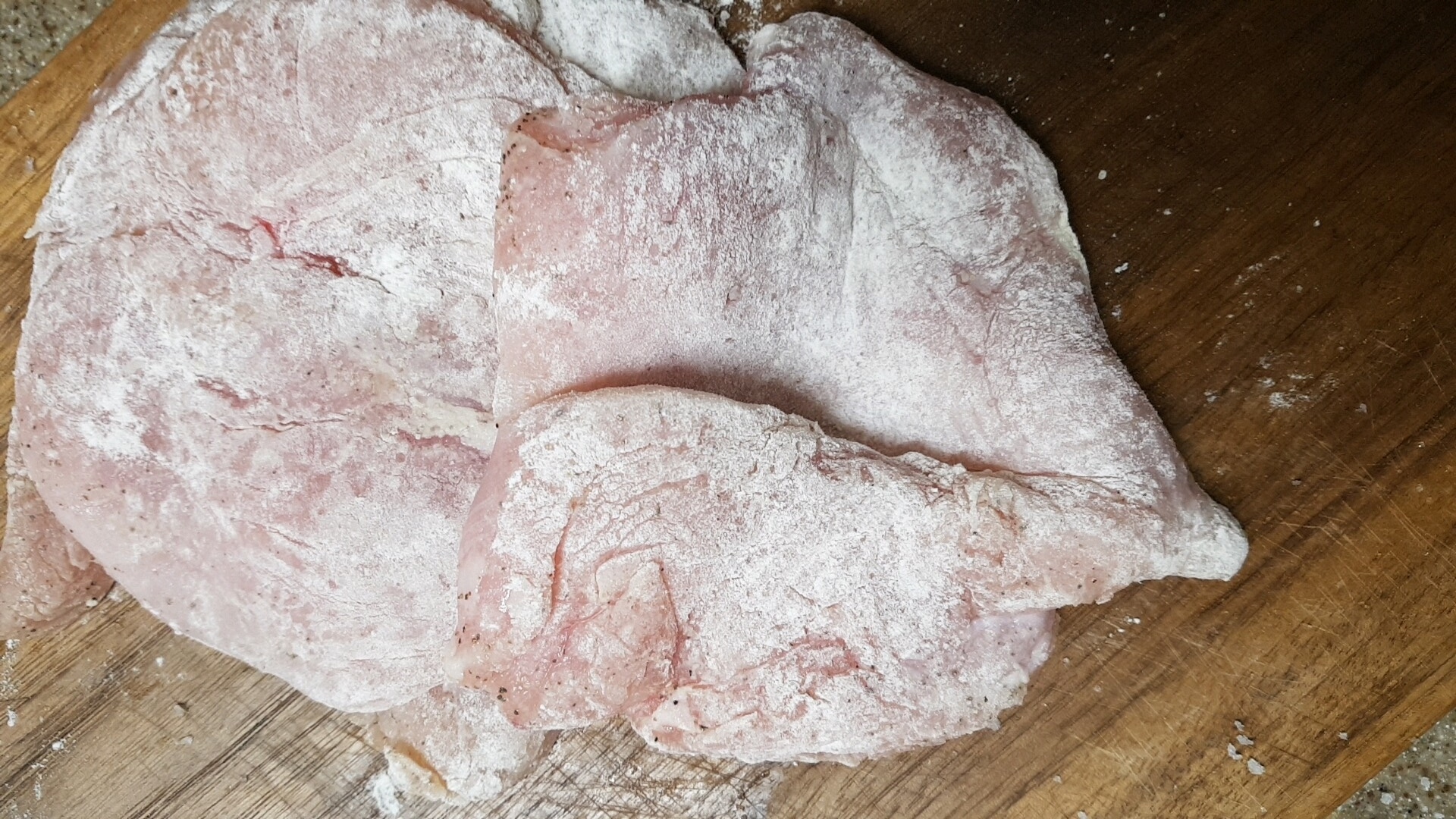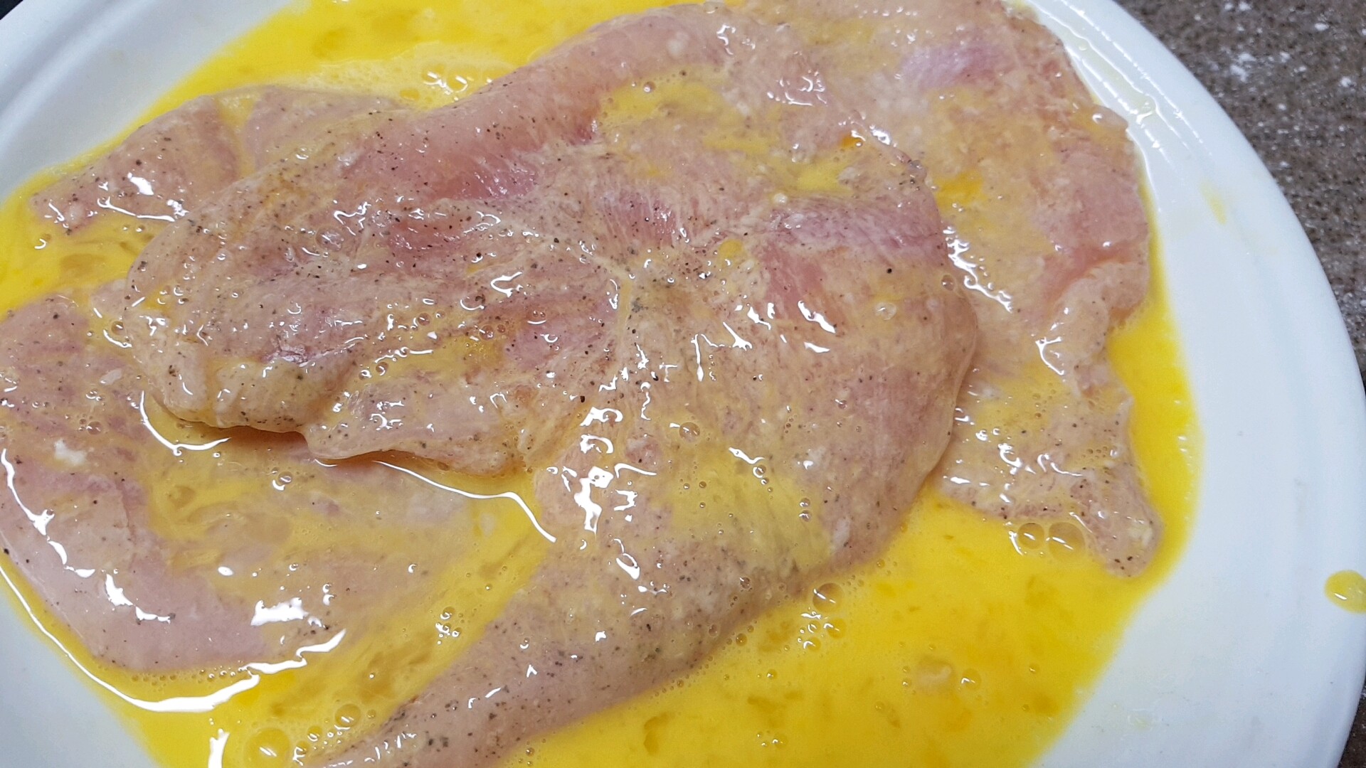 6. 달걀을 흰자와 노른자를 풀어주세요. 그런 다음 밀가루 옷을 입은 닭가슴살을 달걀 옷을 입혀주세요.