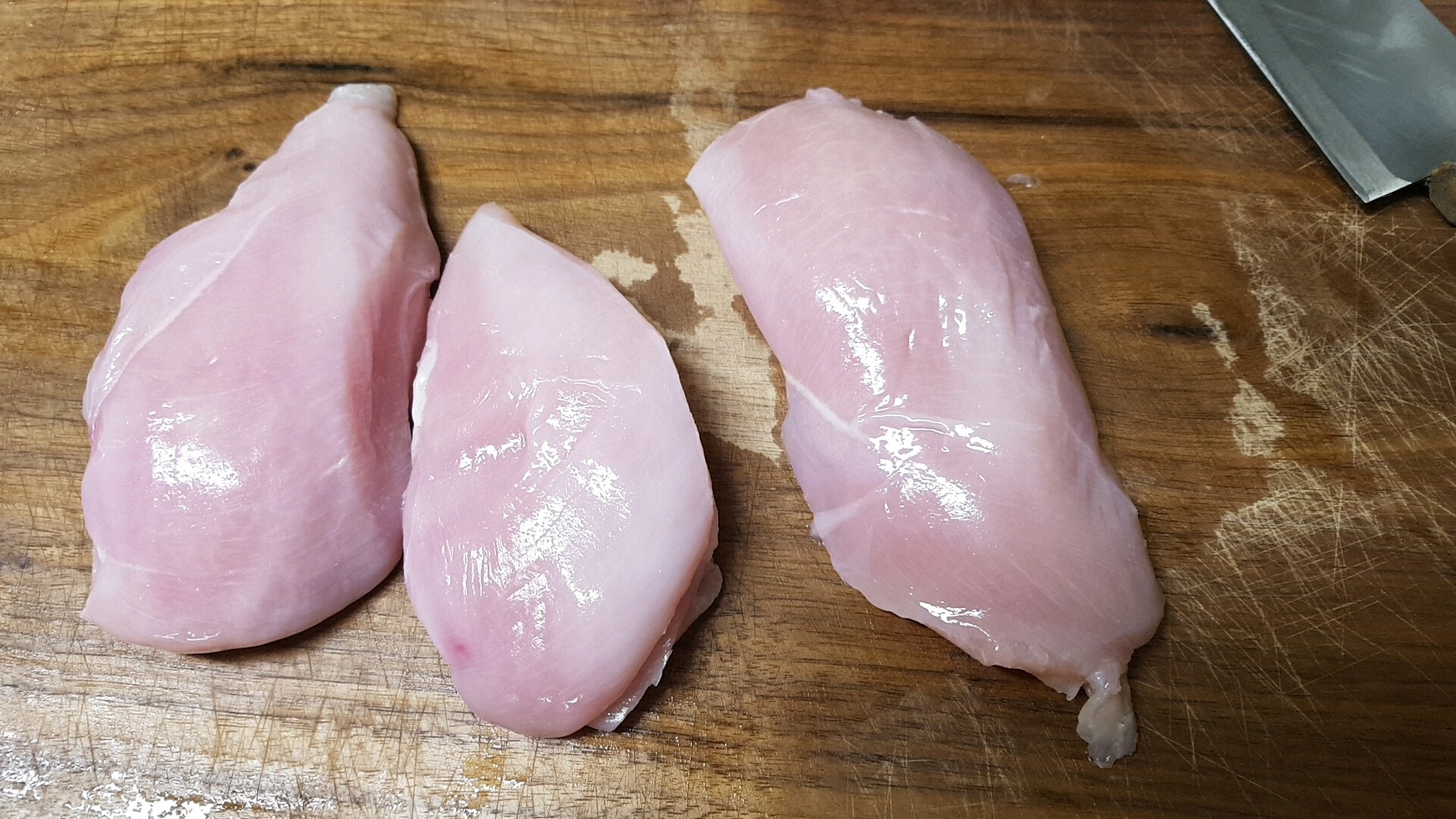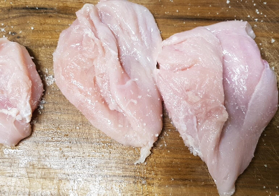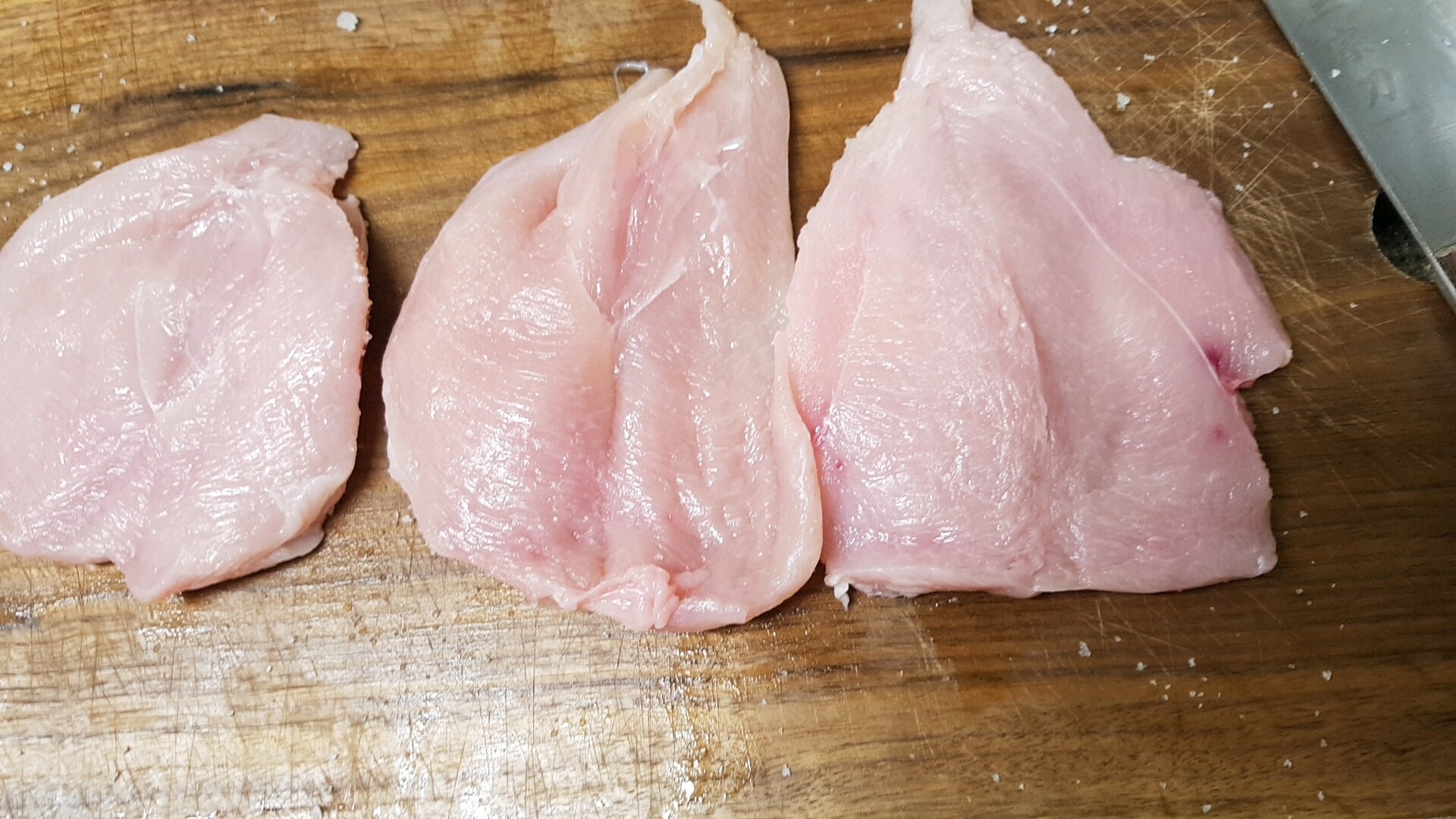 3. 닭가슴살을 옆으로 반을 살짝 가르고 펼치면 이렇게 부채처럼 넓어져요.