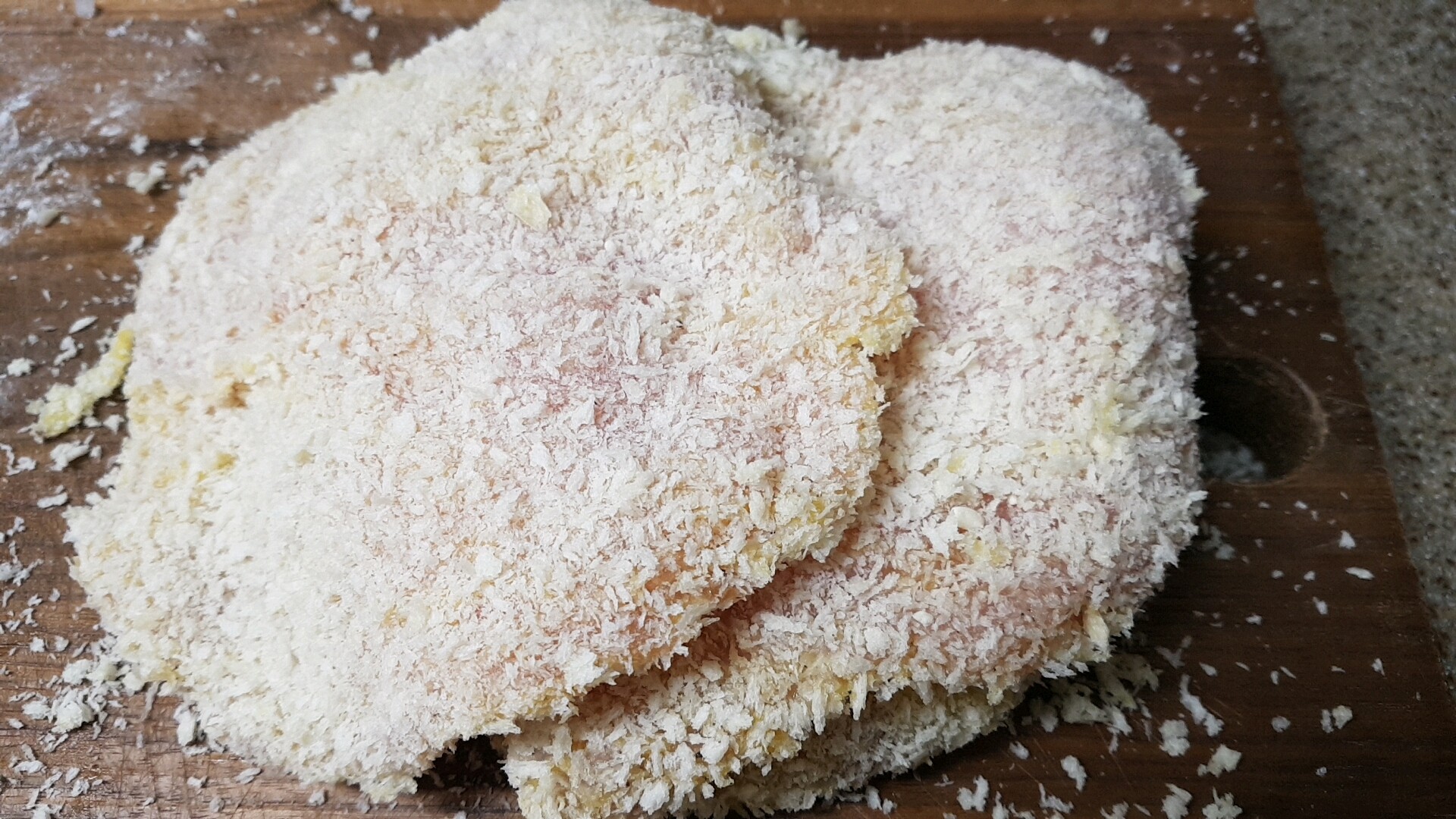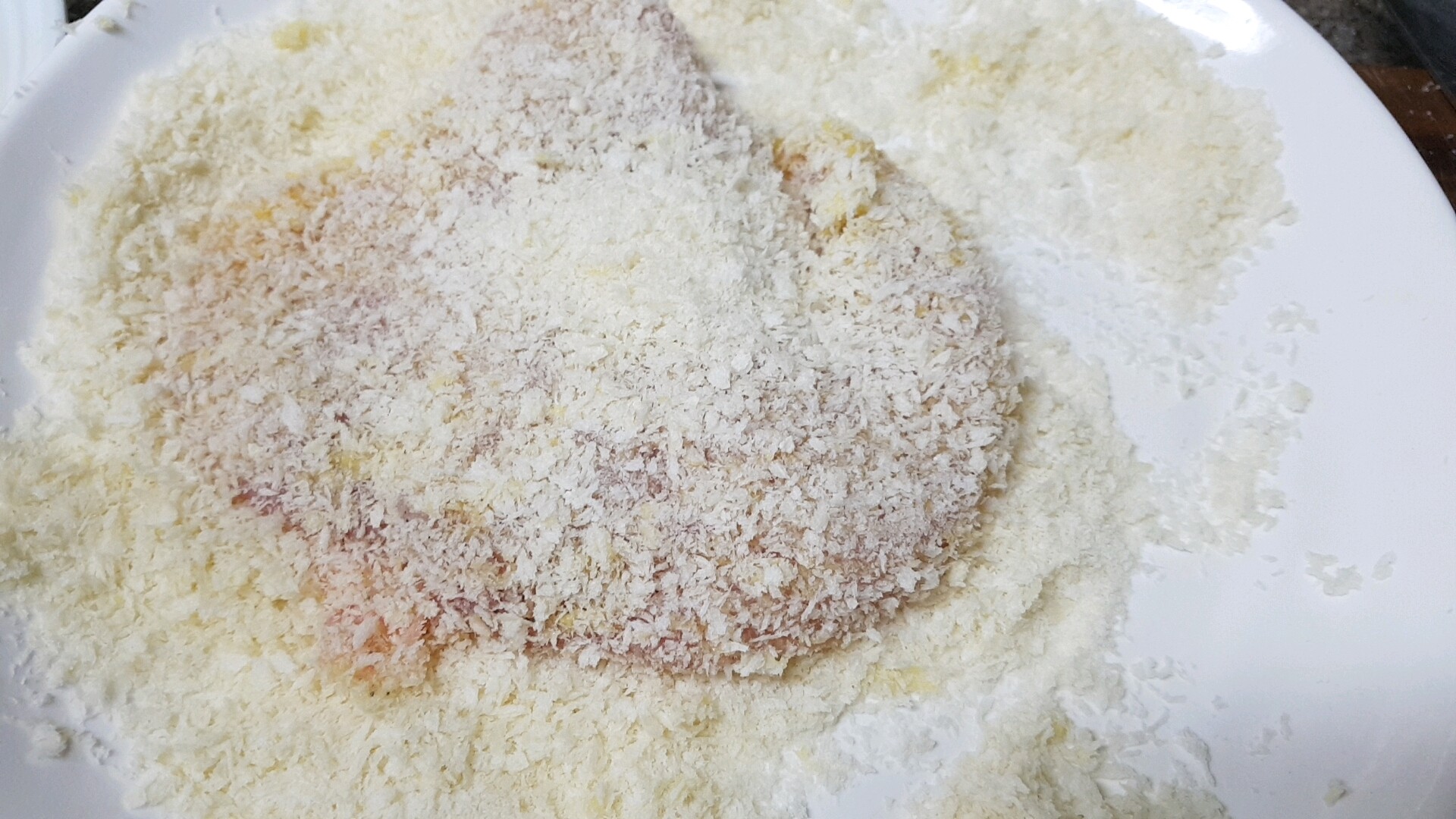 7. 달걀옷 입은 닭가슴살을 빵가루를 묻혀줘요. 묻혀줄 때 힘껏 눌러주는 것도 좋아요. 빵가루가 잘 입혀지기도 하지만 닭고기 두께가 얇아져서 튀길 때 잘 익혀지니깐요.