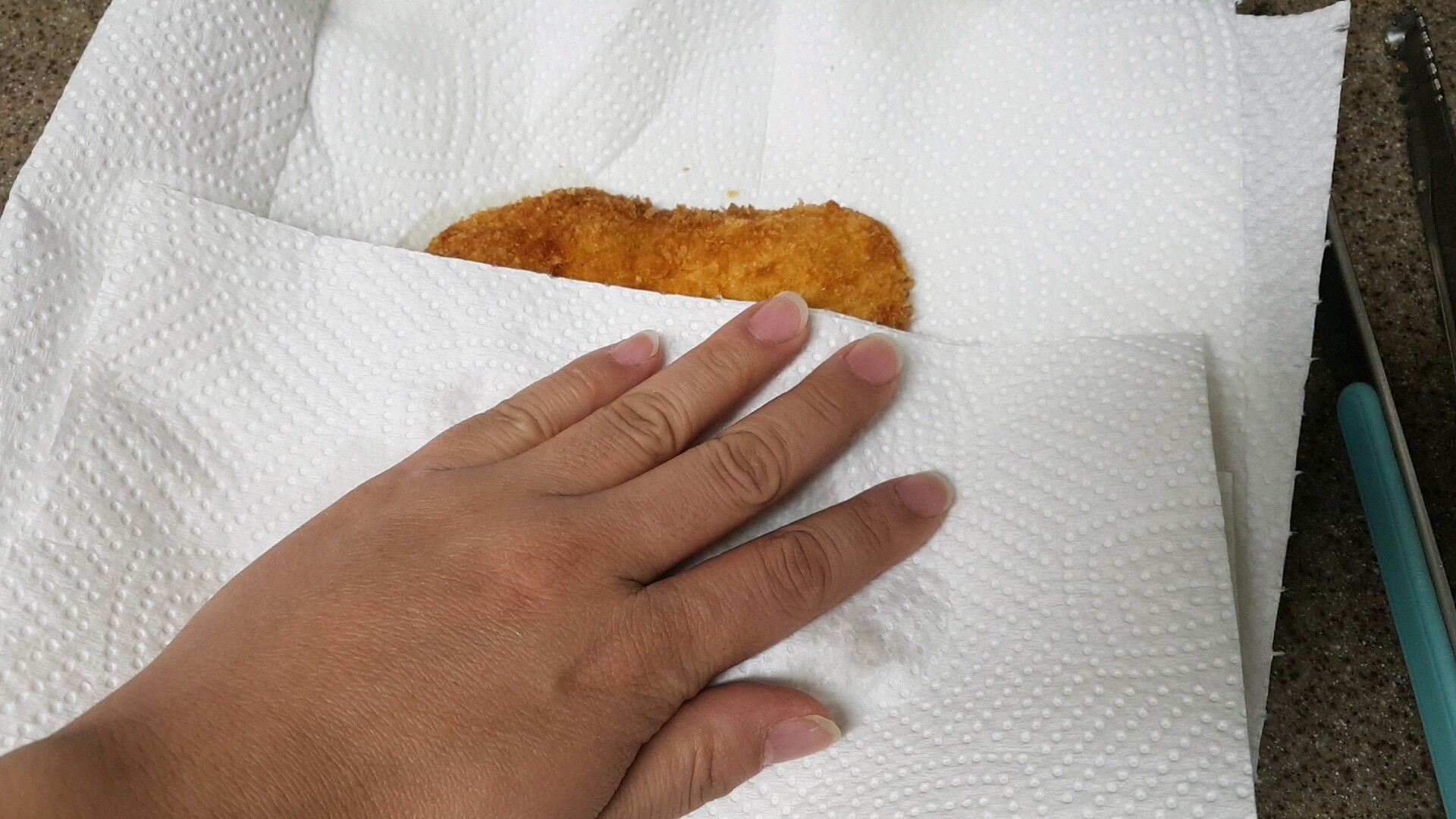 11. 키친타올로 꾹꾹 눌러서 기름을 제거해요. 모양이 닭다리모양이 되어버렸네요.