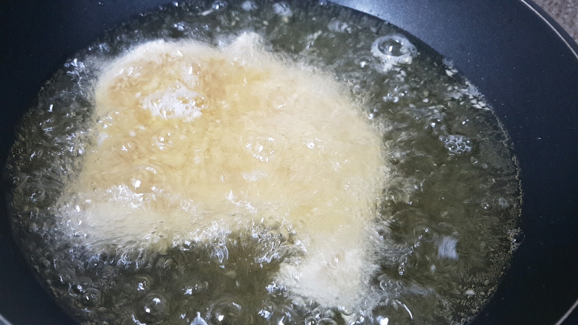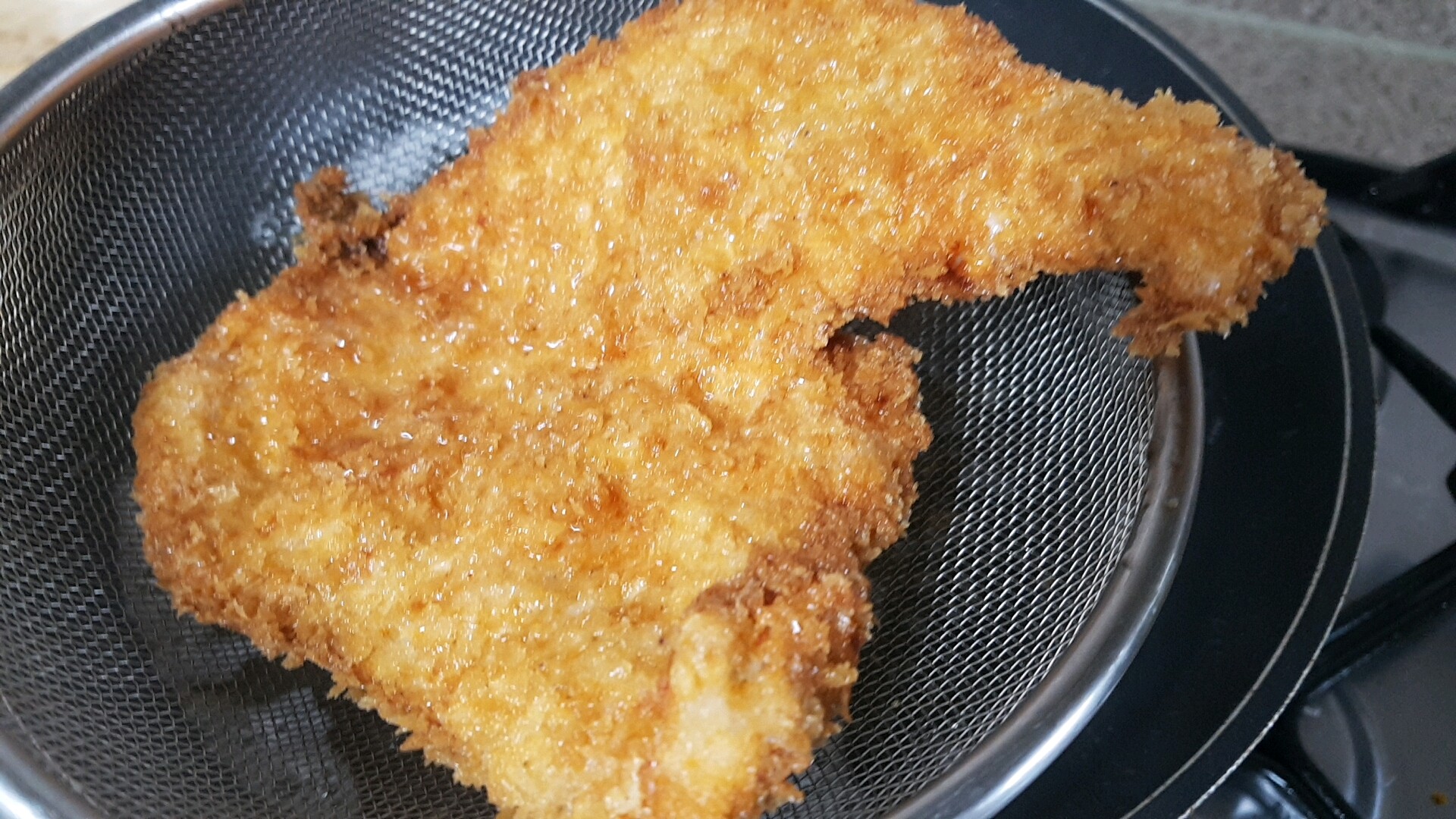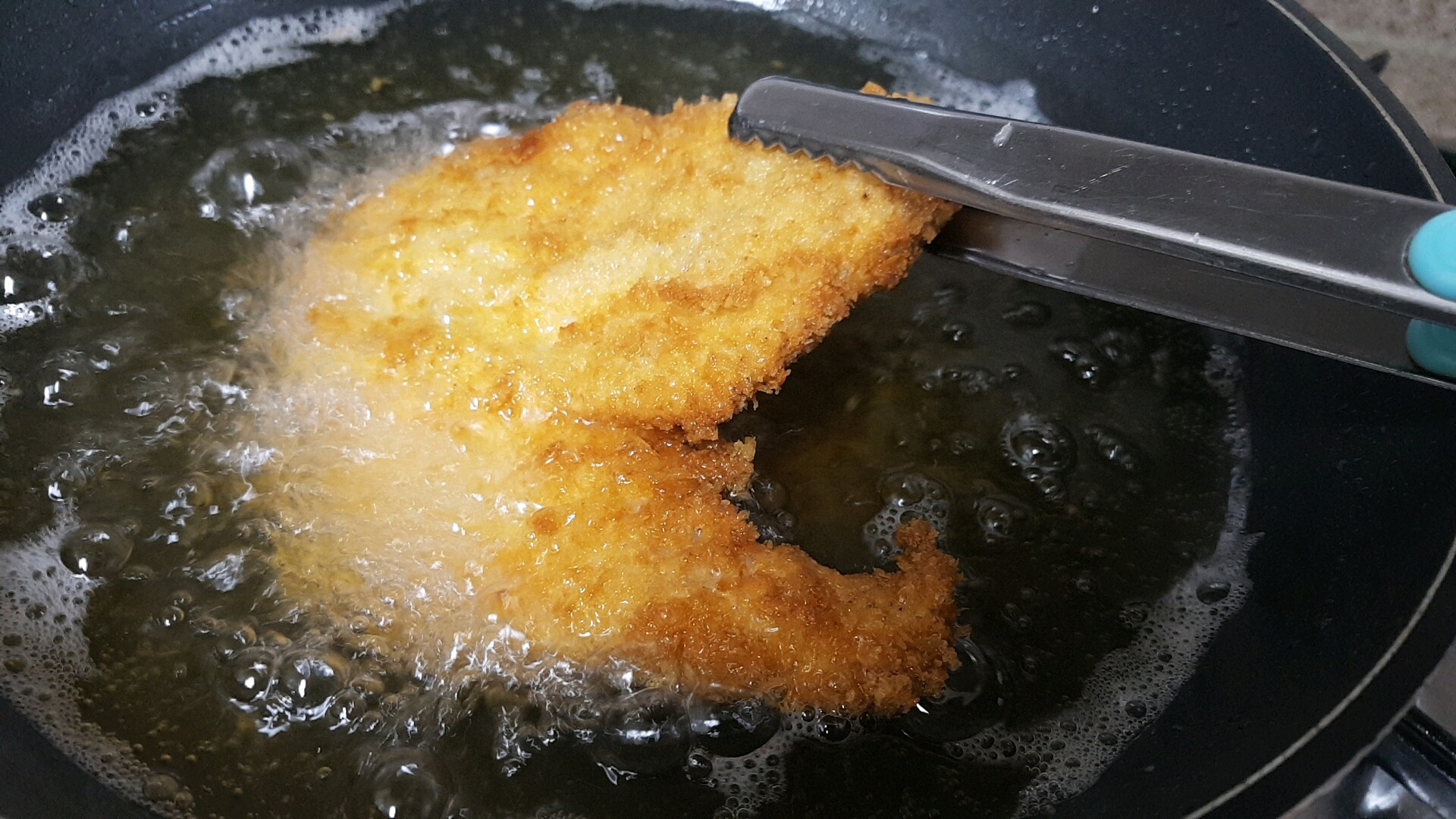 첫번째 튀긴 후 찌꺼기를 제거해주세요. 그리고 온도를 약불로 해서 좀 낮춰줘요. 어느 정도 열을 내린 상태에서 빵가루를 다시 넣어서 가라앉았다가 바로 올라오면 그때 두번째 고기를 튀긴답니다. 그렇지 않으면 두번째 튀김에서 까맣게 타버리게 되니 튀김유의 온도를 주의하셔야 해요.