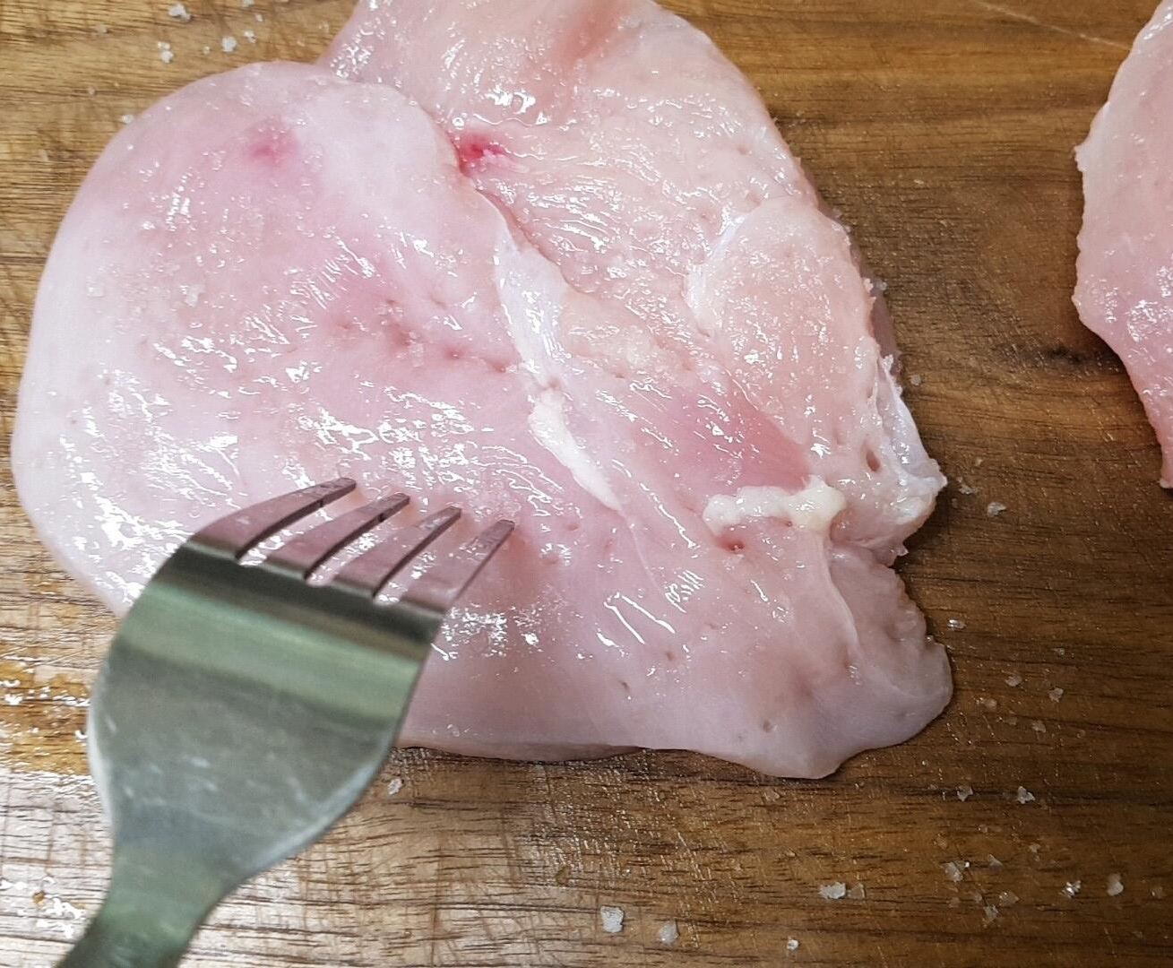4. 닭가슴살에 소금과 후추를 뿌려요. 그리고 포크로 여러 번 찍어줘요. 포크로 구멍을 내는 이유는 튀길 때 고기가 수축하게 되는 것을 방지해주기 위해서이기도 하고 고기 속까지 잘 튀겨지게 하기 위해서이기도 해요.