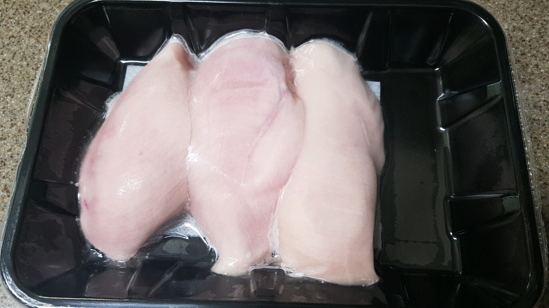 2. 해동된 닭가슴살을 한번 씻어낸 후 키친타올로 물을 말끔히 제거합니다.