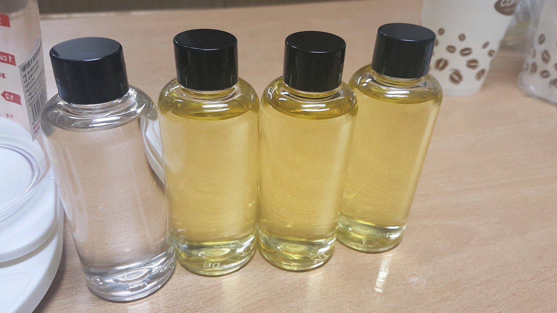 디퓨저는 재료만 있으면 만들기 어렵지 않아요. 비율을 잘 맞춰주고 몇 가지 유념해야할 것만 아니면 누구나 만들 수 있답니다. 그리고 정확하게 만들기 위해서는 저울도 필요하지만 저는 눈금이 있는 컵을 이용해서 비율을 적용했어요. 저는 오늘 3군데를 놔둘려고 많이 만들었어요.