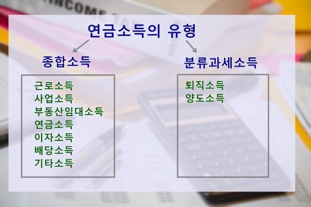 연금소득과 퇴직소득이 있어요. 연금소득은 연금을 일정기간에 나눠서 받는 것을 연금소득이라 하고, 퇴직소득은 일시에 한꺼번에 받는 것을 퇴직소득이라고 해요. 퇴직소득은 다른 소득과 합산하지 않고 퇴직소득만 세금이 따로 부과되어 분류과세로 나뉘어요.