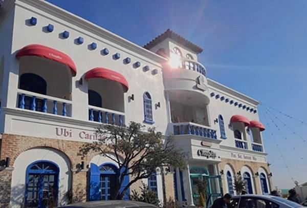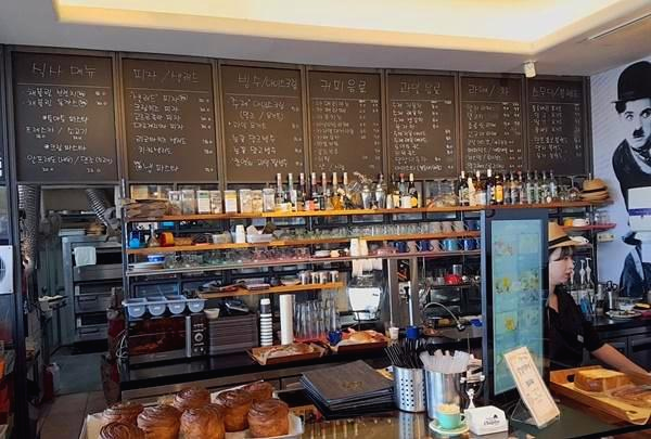 채플린카페는 찰리채플린을 생각이 나는 곳을 알 수 있게 카페 정문에 '모던타임즈 찰리채플린' 이라고 쓰여있었어요. 하얀 벽에 바다색을 입힌 창문의 외곽을 보니 깔끔하네요.