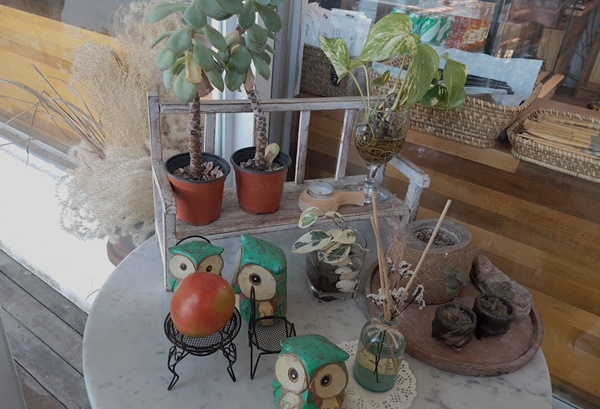 저도 테라스를 구경삼아 내려가보았습니다. 테라스 입구에 아기자기한 부엉이 인형들과 화분들로 미니정원을 만들어놨네요.