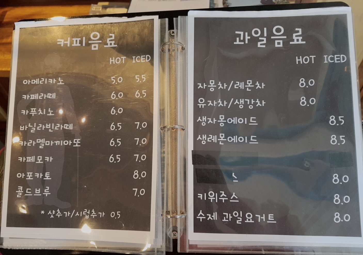 아메리카노는 5,000원이고, 기본이 5,000원 이상이에요. 생과일주스와 에이드도 가격이 만만치 않지만 지중해풍의 카페와 바다가 있는 낭만적인 분위기 값이라 생각했어요.