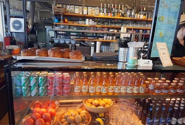 손님들이 많아서 이미 빵 바구니가 빈 곳이 많았어요. 하지만 바로바로 갓 구운 빵이 나오고 있었어요. 그런데다 여러 탄산음료와 주스, 그리고 맥주까지 팔더라구요. 생과일주스도 주문해서 먹고 싶었어요.