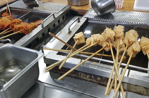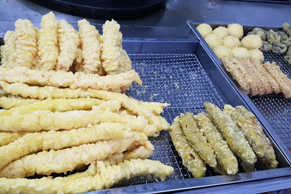그리고 안쪽에 튀김들이 있는데 튀김도 가래떡 크기만큼이나 굵고 크더라구요. 초저녁이라 튀김이 많이 팔려 많은 종류는 없었는데 다음에 일찍 와서 튀김을 골고루 사서 먹어보고 싶네요. 튀김에는 오징어튀김, 새우튀김, 고구마튀김, 달걀튀김, 김말이튀김, 고추튀김 등이 있었어요.