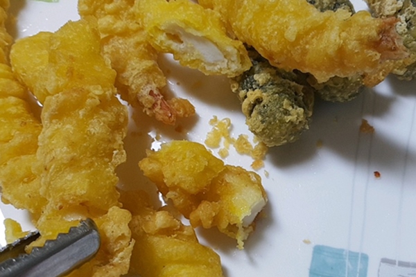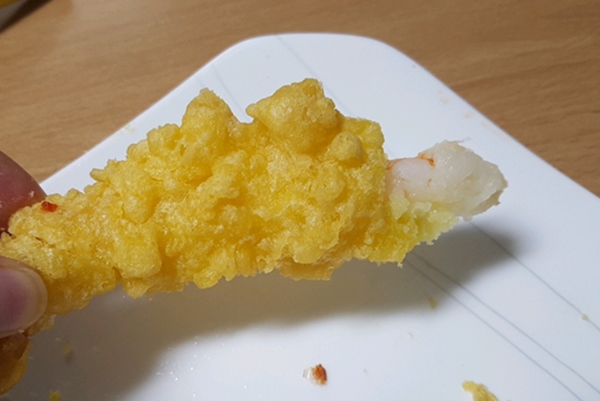 튀김은 바삭하고 튀김옷이 큰 편이에요. 하지만 씹는 느낌이 좋은데 너무 바삭했나봐요. 급하게 먹다보니 입천장이 좀 헤어졌어요.