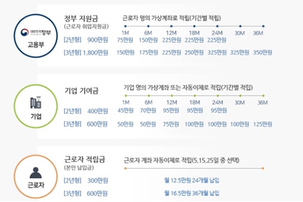 청년내일채움공제 적립구조는 2년형과 3년형으로 나뉜다. 예를들어, (2년형)이면 정부에서 900만원, 기업에서 400만원, 근로자 적립금 300만원을 공제받아 1,600만원부터 시작을 한다. (3년형)이면 3,000만원부터 시작하게 되어 좀 더 높은 목돈을 마련할 수 있다. 2년 후 만기공제금은 1,600만원에서 + α (이자) 를 수령하고, (3년형)은 3,000만원에서 + α (이자) 를 수령할 수 있다.