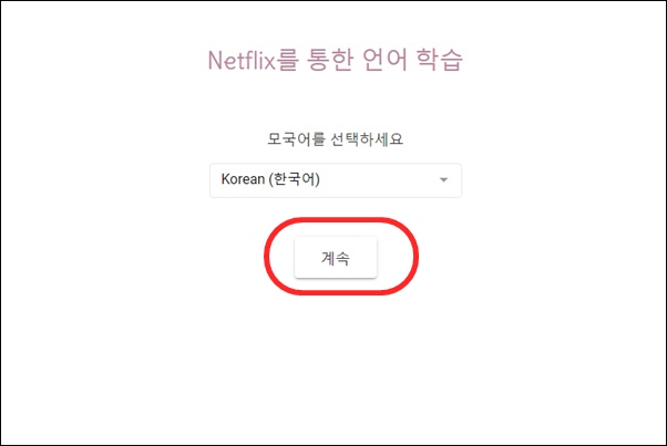 Netflix를 통한 언어 학습에서 모국어를 선택하시면 되요. 이것은 그냥 넘어가시면 되겠죠. '계속' 버튼 클릭하세요.