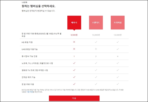 원하는 멤버십을 선택하실 때 베이직, 스탠다드, 프리미엄 세 종류가 있어요. 처음에는 베이직으로 선택하시면 되고 첫 달 한달은 무료이고, 한달 뒤에 결제가 되지요. 베이직은 동시접속 가능 인원이 1명에 9,500원이고 HD 화질이 지원되지 않아요. 스탠다드는 2명에 12,000원, 프리미엄은 4명에 14,500원입니다. 프리미엄의 혜택 한 가지 더! UHD화질 이용이 가능하답니다.