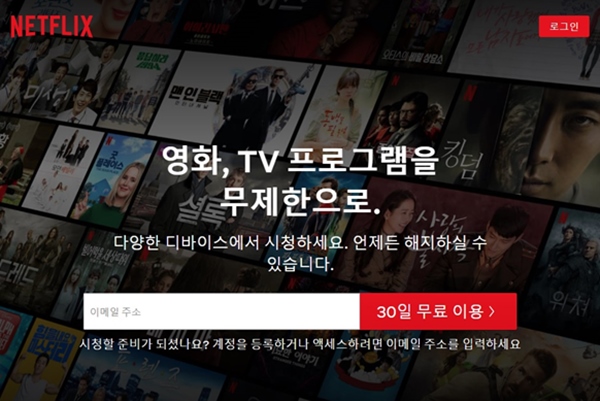 넷플릭스 확장프로그램 설치방법이 끝나고 넷플릭스 홈 화면으로 넘어가시면 빨간색 버튼의 '로그인' 또는 '30일 무료이용' 을 선택하셔서 이용하시면 됩니다.
