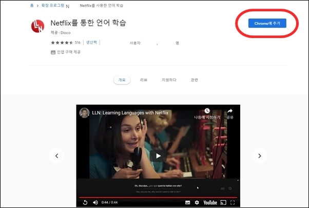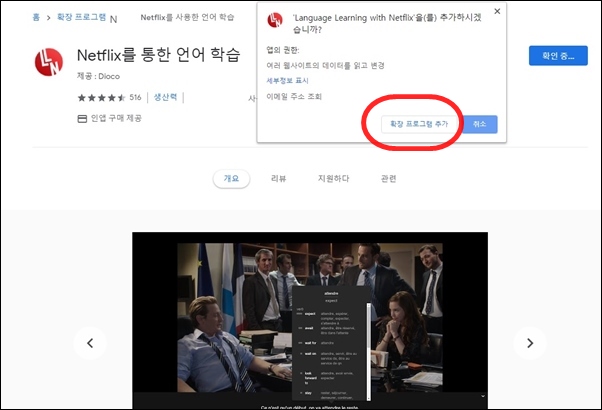 'Chrome에 추가' 버튼을 클릭하면 'Language Learning with Netflix' 를 추가하겠습니까?' 라는 메세지가 나타나요.