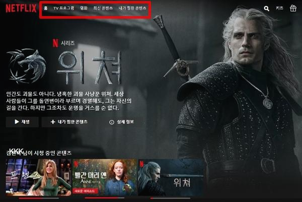 메인 화면에 '홈 TV프로그램 영화 최신콘텐츠 내가찜한콘텐츠' 가 메뉴로 있으니 활용하시면 됩니다.