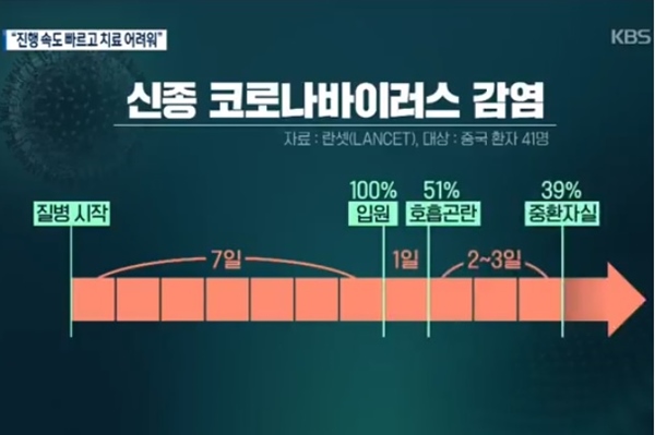보고내용에 따르면 중국의료진이 신종코로나바이러스 초기감염환자 41명의 진료내용을 공개하였습니다. 주목할만한 건 일부 감염환자의 진행속도가 빠르다는 것입니다. 대부분 증상이 심해져 일주일만에 입원했고, 입원한 환자의 절반가량은 하루만에 호흡곤란이 생겨 2 ~3일 뒤 중환자실로 옮겨졌습니다.