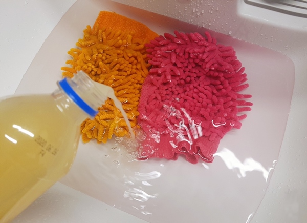 EM발효액에 베이킹소다, 그리고 식초를 넣어 섞은 물에 헹주를 담가놓으면 헹주의 얼룩과 냄새, 그리고 나쁜 균들을 없애줄 수 있습니다. 이 방법이 귀찮으면 헹주를 비누로 빤 다음 마지막 헹굼물에 EM발효액을 섞어 헹궈서 말려도 됩니다.