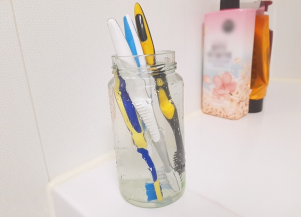 첫번째 활용법은 칫솔소독입니다. 아이들은 아침 저녁으로 칫솔질을 한 후 물로 대충 헹군 후 칫솔꽂이에 꽂지않고 아무렇게나 놔두고 가버리기 일쑤입니다. 칫솔에 번식하는 나쁜 균을 없앨 수 없을까 싶어서 EM발효액을 위와 같이 유리병에 물과 섞어 30분이상 칫솔을 담가놓았더니 칫솔모 구석구석 깨끗함이 눈에 보였습니다. 그리고 칫솔꽂이의 물때도 보이지 않네요.