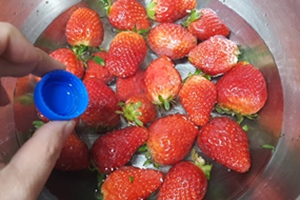 과일 껍질을 통째로 먹고 싶어하는 저는 EM발효액을 넣은 물에 20분에서 30분 정도 담가둬 과일에 묻어있는 약을 제거합니다. EM발효액으로 씻은 과일은 윤기가 나고 쉽게 상하지 않습니다. 껍질이 없는 딸기같은 과일일 경우는 너무 오래 담가놓을 때 딸기의 단맛이 사라지기 때문에 3~5분정도만 담가놓고 씻어냅니다.