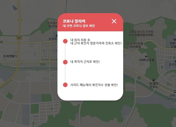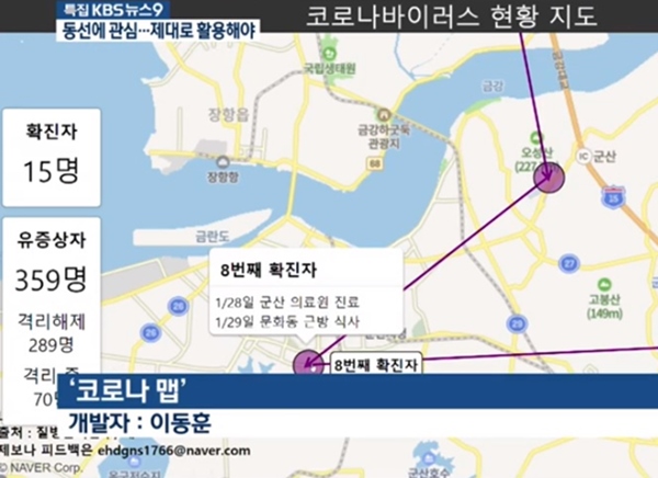 코로나알리미서비스는 고려대 소프트웨어 벤처학회 멤버 4명이 만들었다고 합니다. 위치기반서비스(GPS)를 이용해 자신이 있는 곳이 확진자가 지나간 곳인지 한번에 알려줍니다. 그리고 1월 30일에 이미 경희대 학생이 신종코로나바이러스 확진자의 동선을 한눈에 볼 수 있는 '코로나 맵'을 제작했었습니다.