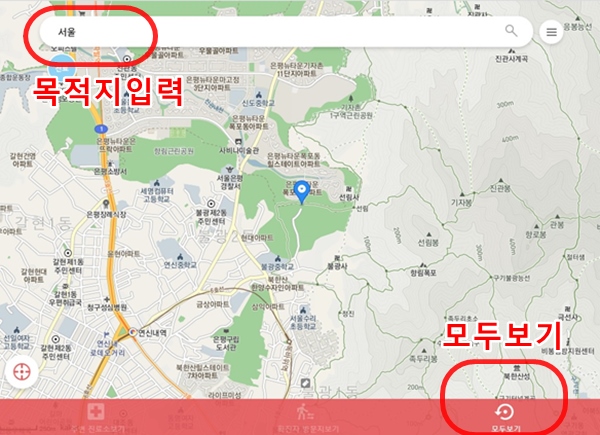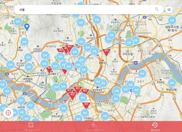 코로나알리미서비스 화면에서 목적지를 '서울' 로 설정하여 검색해보겠습니다. 그리고 '모두보기'를 하면 확진자와 진료소위치를 확인할 수 있습니다.