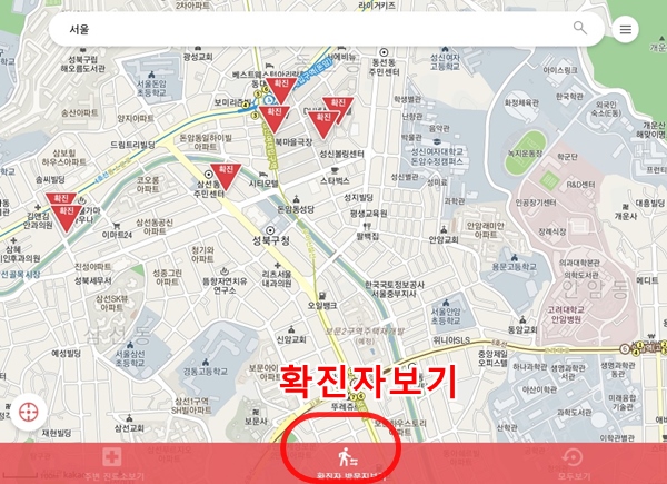 코로나알리미서비스에서 확진자가 다녀간 위치만 보고 싶을 때 가운데 메뉴인 '확진자보기' 를 클릭하시면 됩니다.