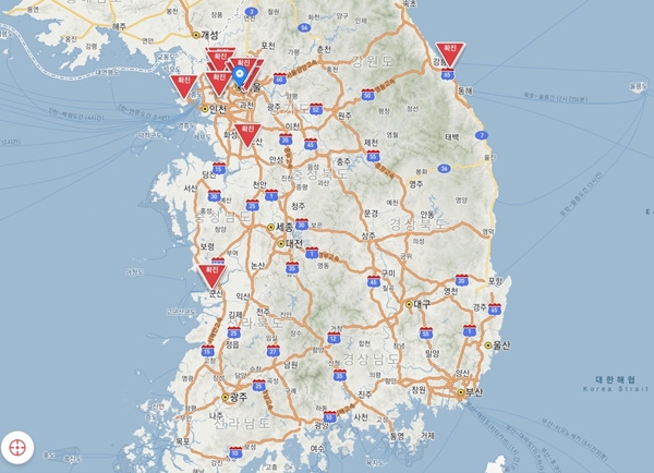 빨간색 표시가 확진자가 다녀간 위치이고, 하늘색 표시가 진료소 위치입니다. 역시 수도권에 확진자가 많다는 것을 알 수 있네요.