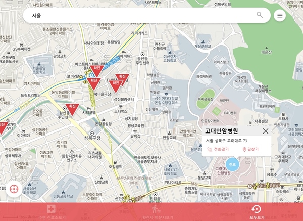 서울 성북구에는 고대안암병원이 신종코로나바이러스 진료소임을 알 수 있습니다. 진료소를 클릭하니 진료소 위치와 전화걸기, 길찾기 서비스를 이용할 수 있는 장점이 있습니다.