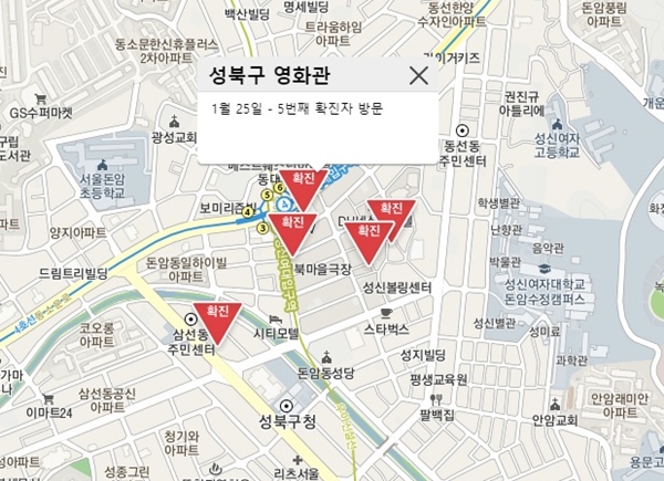 확진자가 어떤 곳을 다녀갔는지 자세한 정보를 알고 싶으시면 확진표시를 클릭하면 됩니다. 날짜와 장소, 그리고 몇 번째 확진자가 다녀갔는지 알 수 있습니다. 이 정보는 이 근처 가야할 일이 있을 때 유용한 정보가 될 것 같네요.