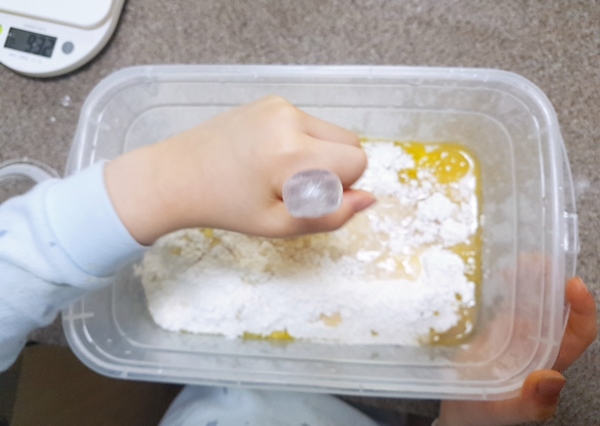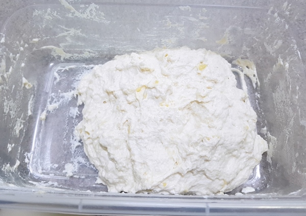 손으로 치대면서 반죽하는 것이 아니라 주걱으로 고루 섞어주세요.